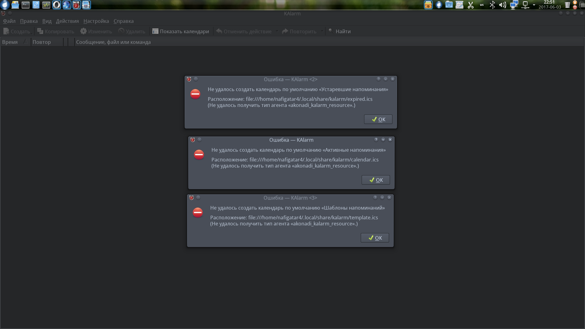 VictorR2007 спасибо. в общем оказалось хватает и akonadi-calendar-tools. но вот только созданное задание выполняет на 3 часа позже чем указываю в самом kalarm.в настройках самого kalarm есть только часовой пояс UTC.где не состыковка ? не пойму