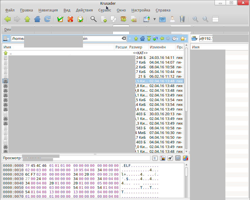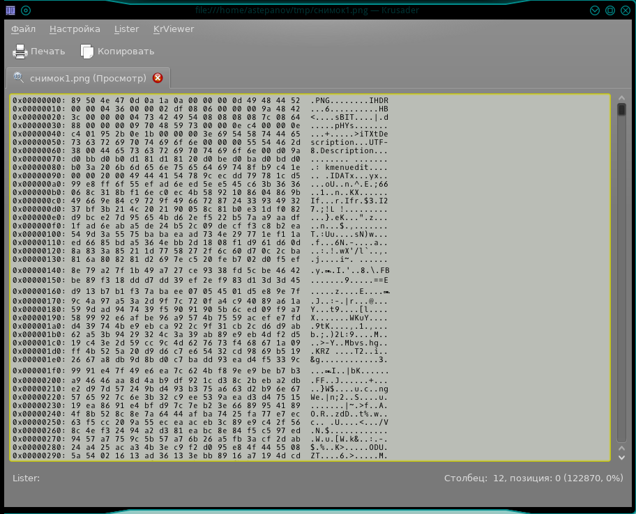 Еще вопросы есть. Я в krusader просматриваю бинарные файлы, через okteta, она лучше стандартного lister (работает отлично), тем что подсвечивает. Но okteta иногда падает и с ней krusader.