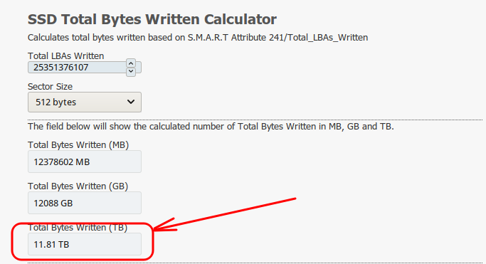Т.е. гарантированный TBW (Total Bytes Written или Terabytes Written), который обычно предоставляется поставщиком в своих спецификациях.Это значение описывает, сколько терабайт может быть записано на устройство до истечения срока гарантии. Значение считаное из S.M.A.R.T. в поле Total_LBAs_Written умножается на размер сектора.