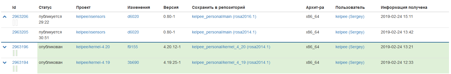 Kelpee писал(а): 25 фев 2019, 21:54 Собрал пакет, но не могу опубликовать его в своей персональный репозиторий .../main (платформа rosa2014.1 и rosa2016.1). Публикуется уже более 30 часов. И конца не видно .
