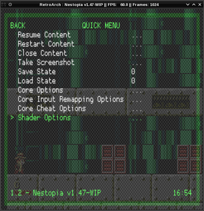 Обновил RetroArch до версии 1.2. И обновил набор шейдеров, которые к нему прилагаются (их стало больше на порядок). Однако меню настройки шейдеров в новой версии было перенесено из главного меню в быстрое меню, вызываемое по F1 во время игры. Очень неочевидное решение.