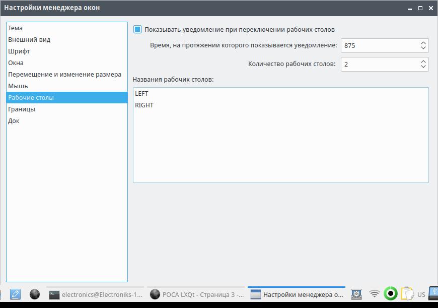 С начала настраиваешь в оконном менеджере openbox количество столов и названии .Olej писал(а): 13 дек 2019, 22:28 Т.е. можно ли создать 4-6-10 виртуальных рабочих столов и как между ними переключаться?