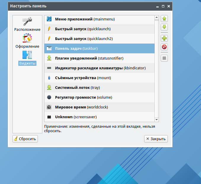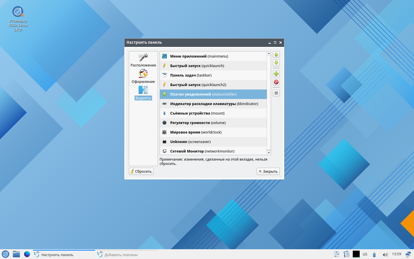 В панели (LXQt Panel) при включении плагина System Tray пиктограммы системного лотка теперь размещаются внутри области уведомлений (Status Notifier), что позволило решить проблемы с показом системного лотка при включении автоскрытия панели. Для всех настроек панелей и виджетов обеспечена работа кнопки сброса изменений в исходное состояние (Reset).