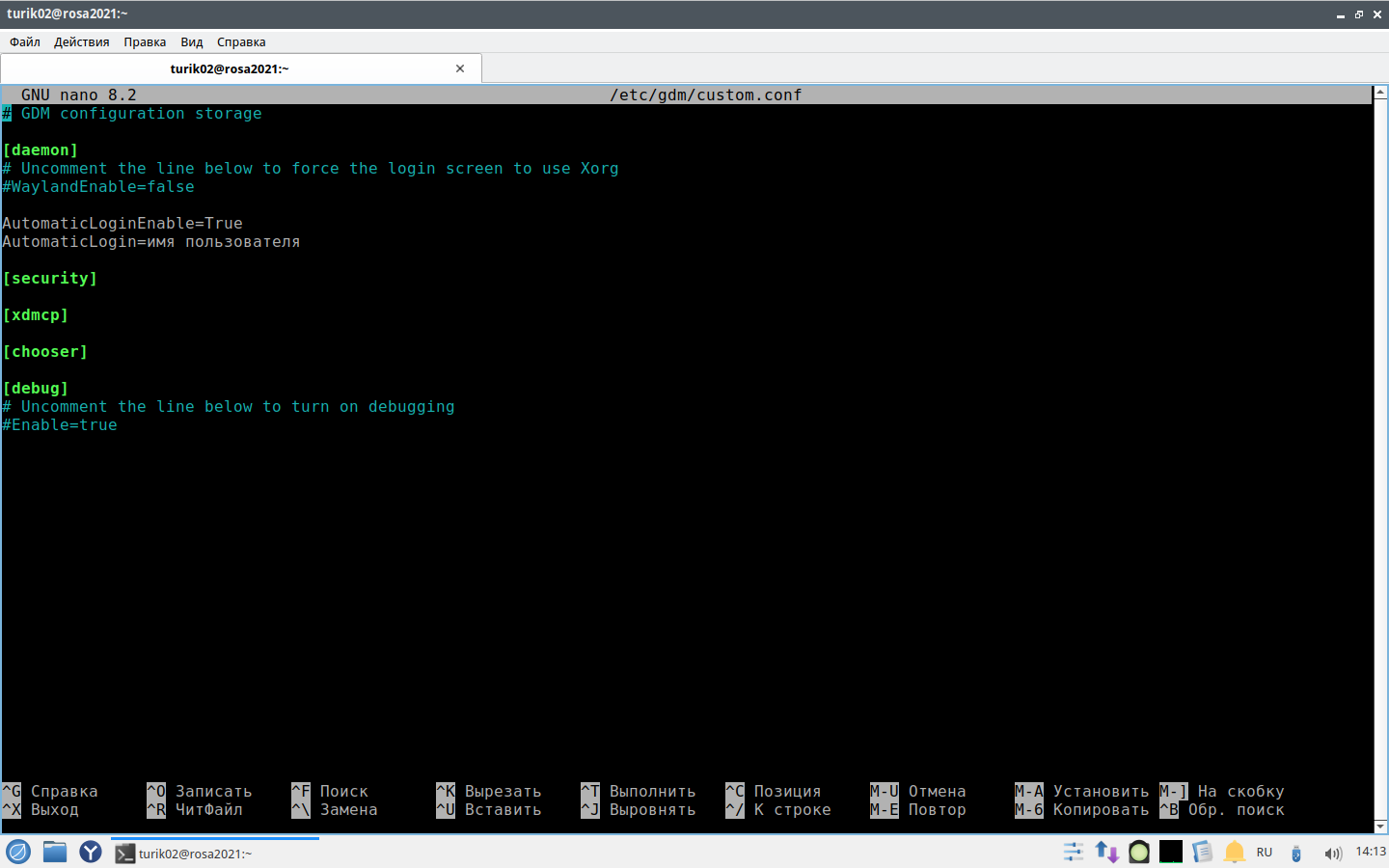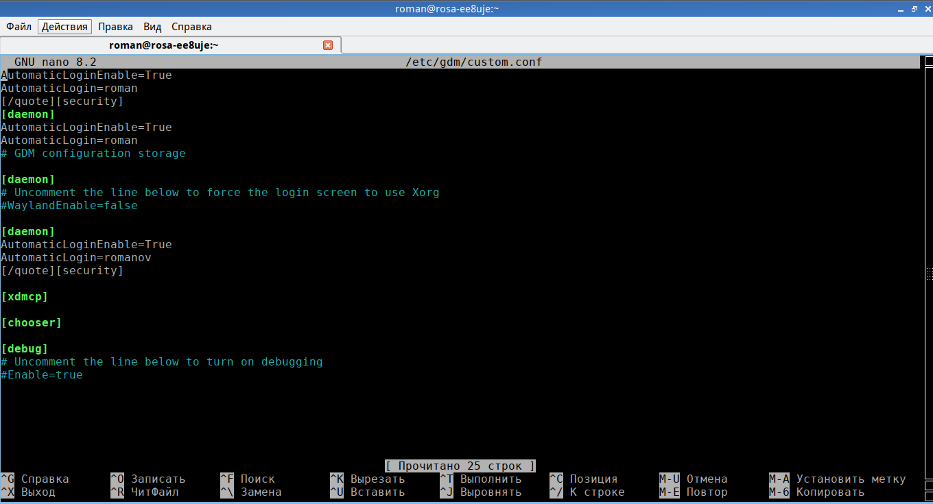 $ sudo nano /etc/gdm/custom.confCtrl+S сохранить, Ctrl+X выйти.