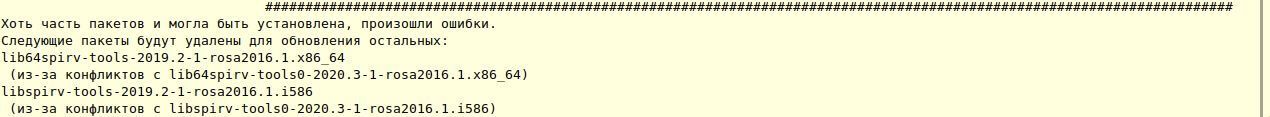 Zeffanyx писал(а): 08 июл 2020, 18:27 Подобные проблемы существуют тут годами. Если коротко, то lib64spirv-tools-2019.2-1 и lib64spirv-tools0-2020.3-1 воспринимаются urpmi как два несвязанных пакета, хотя в теории это должен быть 1 пакет в разных версиях.