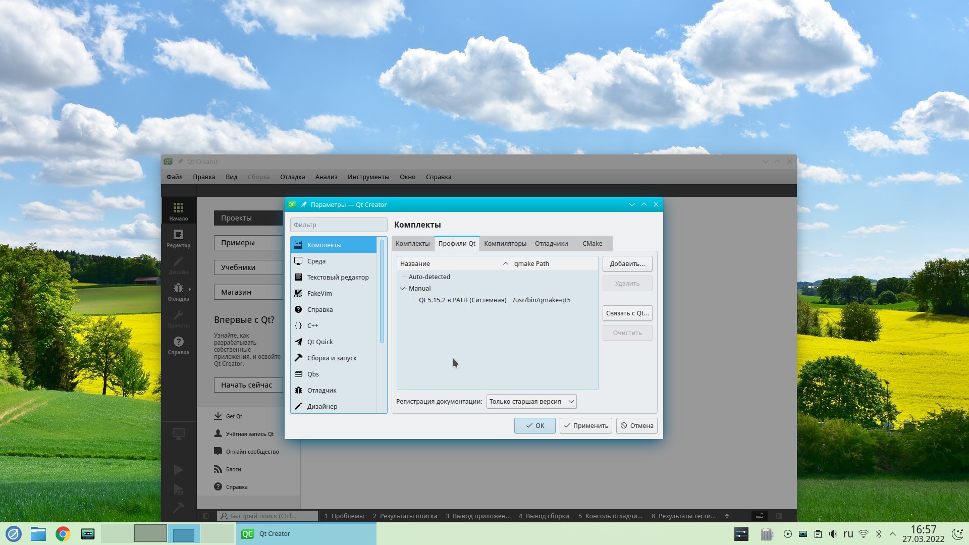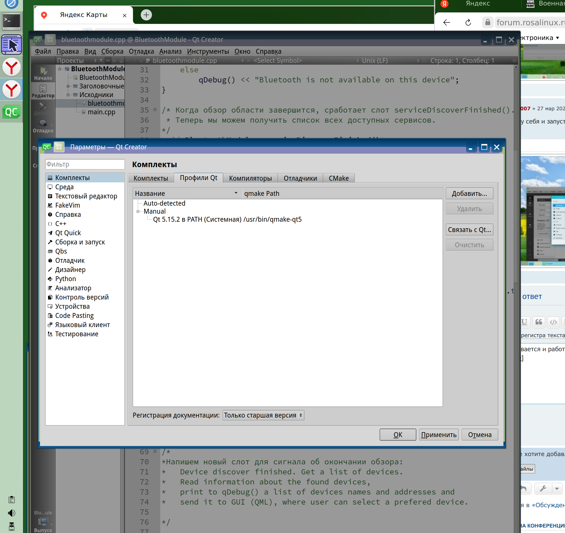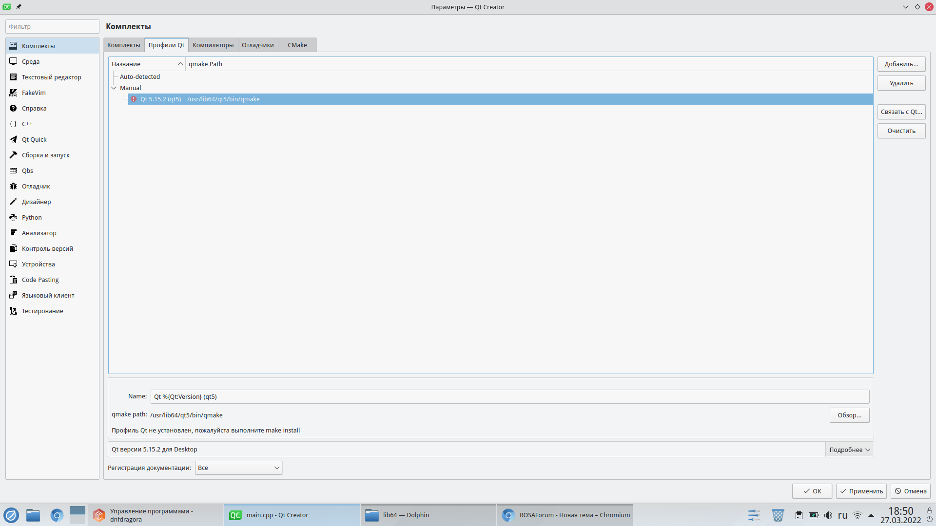 Проблема такова, ранее ставил qt с оф сайта, собирал qt из исходников, а теперь скачивание qt не доступно. Решил скачать и установить на голую ось ROSA Fresh Desktop 12.2 из оф репов росы, но был удивлён, профиль qt автоматом не ставится. Товарищи, пытался поставить с помощью скачивания отдельно qmake из репов, пытался сам собрать из исходов, редактировать переменные среды. Результата нет. Кто подскажет как сделать креатор работоспособным?