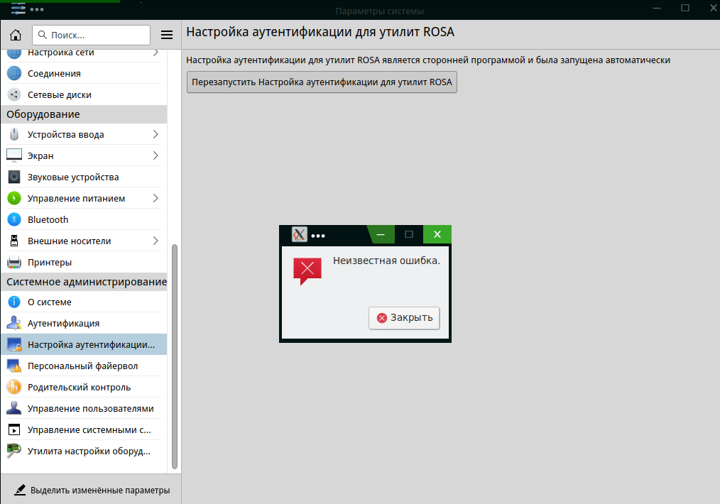 В настройках аутентификации для утилит ROSA появляется неизвестная ошибка. В чём может быть причина?