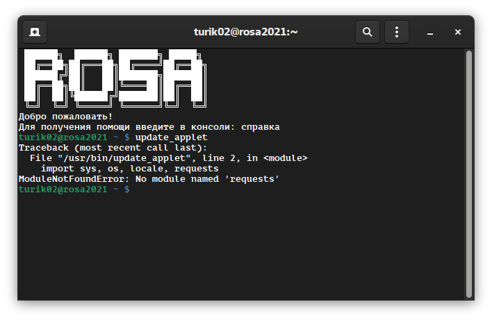 Попробовал установить ROSA на virtualbox и сначала апплет работал. После перезагрузки ОС, апплет не работает.