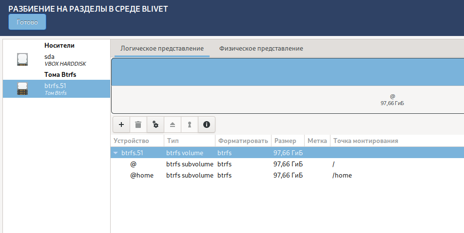 3. В разделе Тома btrfs на созданном разделе создать подтом Btrfs, Имя: @home ; Точка монтирования: /home .