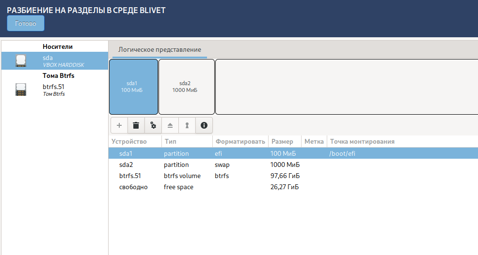 Пробовал снова, через Blivet-GUI точка монтирования ставится, но после нажатия Готово, показывается ошибка конфигурации.