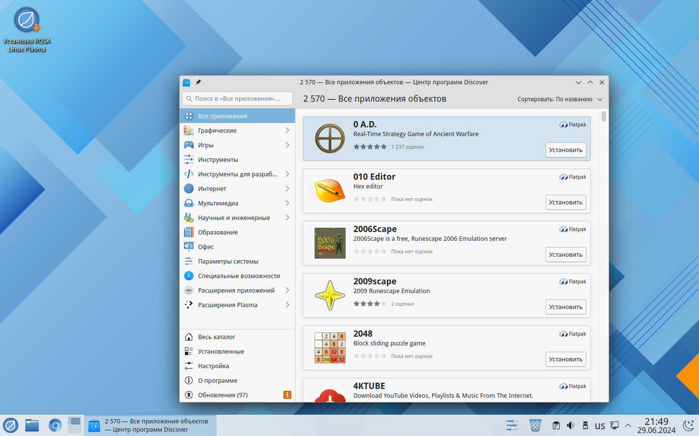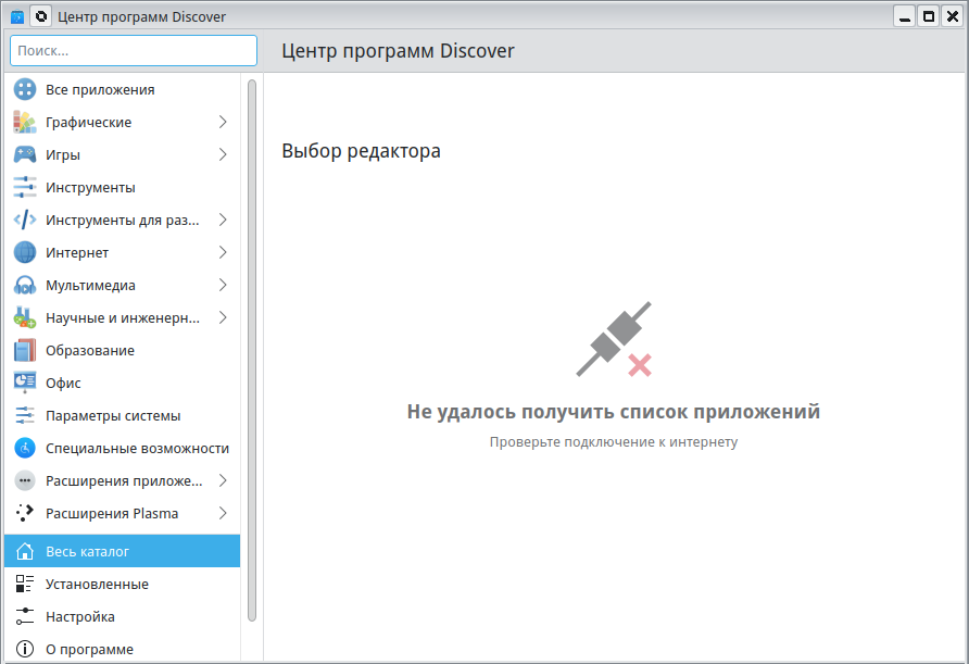 В новую ROSA.FRESH.PLASMA5.12.5.1.x86_64 установил Discover. Но он выдает ошибку: "discover не удалось получить список приложений", хотя интернет в порядке. Подскажите, пожалуйста, по подробнее - для чайников.