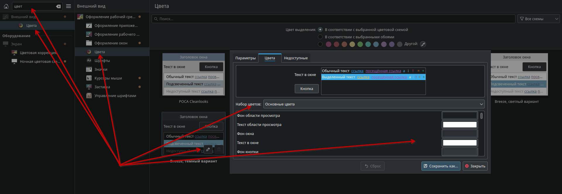 В документации КДЕ5 https://docs.kde.org/stable5/ru/plasma- ... index.html написано, что в systemsettings, также как и ранее в настроечной утилите КДЕ4, есть редактор цветовых схем, позволяющий редактировать цветовые схемы, а не просто загружать готовые. Или я его не могу там найти, или его теперь нужно устанавливать отдельно, или его потеряли при сборке KDE. И как теперь, кроме гадания в текстовом редакторе, цвет фона поменять?