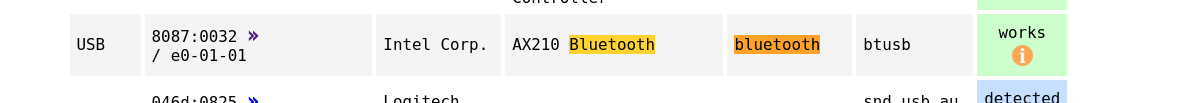 У вас интеловский модуль, драйвер должен быть в ядре, но на такой старый модуль может уже и убрали. Вам, надо понижать версию ядра.Barmalei писал(а): 11 апр 2025, 20:27bluez на месте, что дальше?kartavenko писал(а): 11 апр 2025, 20:24 Должно, но bluez устанавливается не полностью Так же, может быть не установлен firmware, который требуется адаптеру.