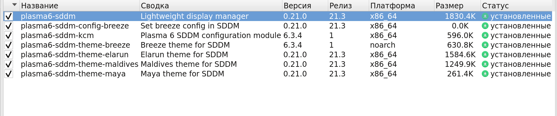 У меня plasma6-sddm-*av179120 писал(а): 16 апр 2025, 10:36 В репах лежат sddm-theme и plasma6-sddm-theme.