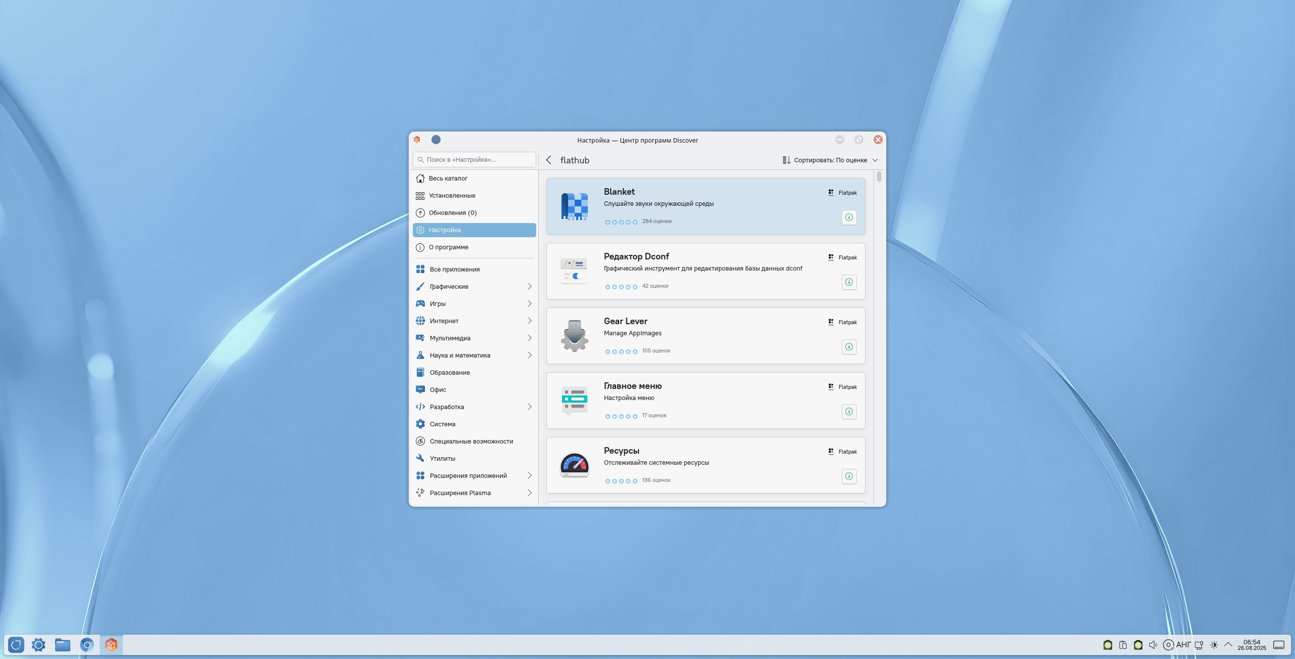 flatpak remote-add --if-not-exists flathub https://flathub.org/repo/flathub.flatpakrepoПосле установки plasma6-discover перезапускаю сеанс.