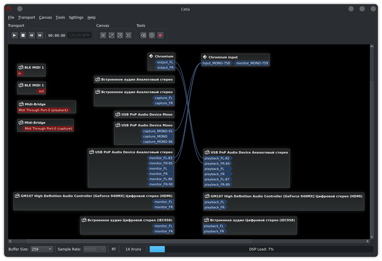 Как решить вопрос семплрейта мне подсказал turik02 в теме про Vitalium, за что ему большое спасибо! А вот с захватом звука у меня затык. В PipeWire я приноровился делать посыл вручную при помощи Catia, но, во-первых, это непрактично, а во-вторых, PipeWire воспринимает каждое приложение отдельно и замечает их только тогда, когда они звучат, т.е. я не могу послать звук с компьютера в мессенджер заранее, как это было с общим входом в JACK, вначале мне приходится открыть мессенджер и сказать что-нибудь в микрофон, чтобы PipeWire обнаружил Chromium Input - такие себе пляски с бубном. На втором скриншоте Chromium - это браузер, из которого звук идет на колонки, а Chromium Input - это мессенджер, который забирает звук с микрофона и с колонок. Я не знаю, почему все называется Chromium, нужный результат я получил методом научного тыка.