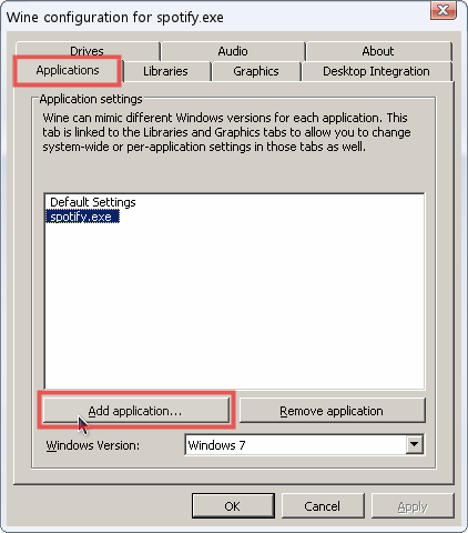 winecfg This may be the first item in the list, otherwise if you do not do Spotyfy sound will be distorted.