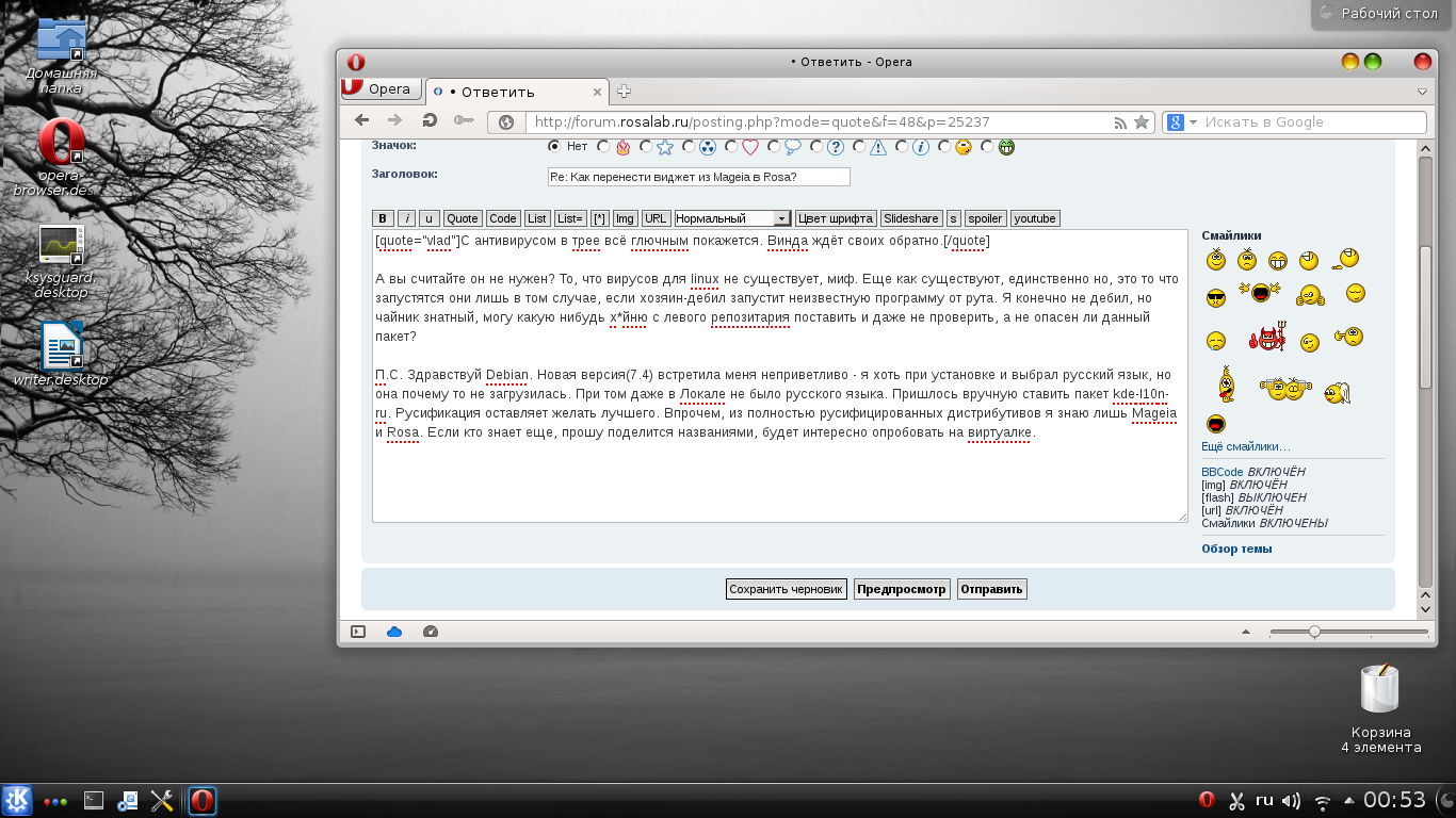 П.С. Здравствуй Debian. Новая версия(7.4) встретила меня неприветливо - я хоть при установке и выбрал русский язык, но она почему то не загрузилась. При том даже в Локале не было русского языка. Пришлось вручную ставить пакет kde-l10n-ru. Русификация оставляет желать лучшего. Впрочем, из полностью русифицированных дистрибутивов я знаю лишь Mageia и Rosa. Если кто знает еще, прошу поделится названиями, будет интересно опробовать на виртуалке.