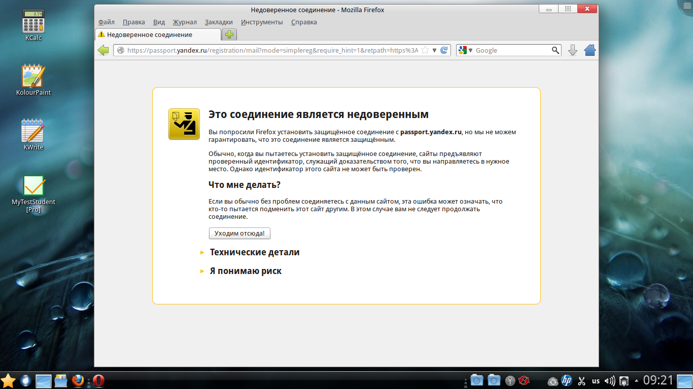 Это не помогает.PastorDi писал(а):В Firefox там видите надпись "Я понимаю риск". Жмёте на нее и принимаете сертификат. И всё должно работать.