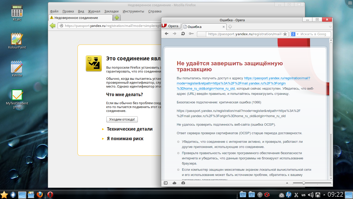 Помогите решить проблему: есть 11 одинаковых компов, все установлено на одном и образ размножен на все клонезиллой. На всех все ок. На одном глюк с соединением защищенным - нельзя войти в почту или зарегистрироваться (например, на яндексе). Проверено в двух браузерах - фирефоксе и опере.