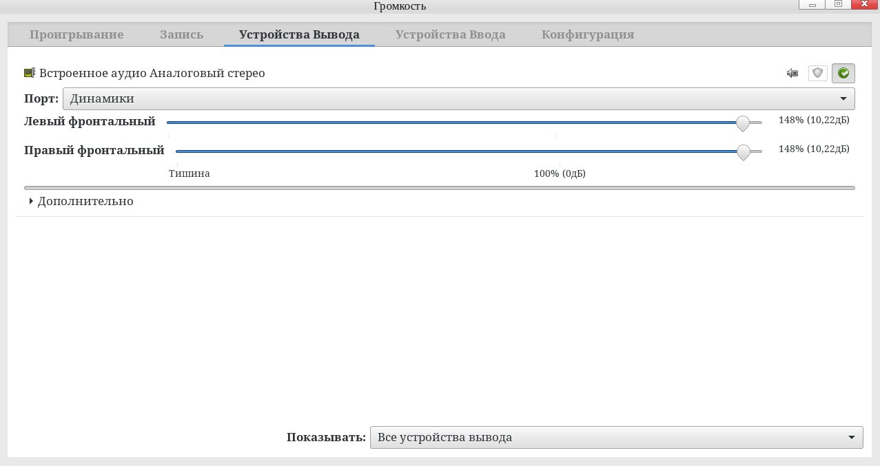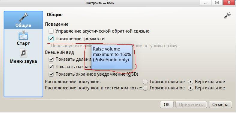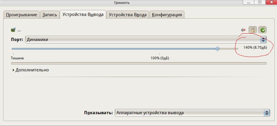 Вы не указали, что это в рабочем окружении MATE.zidar писал(а):звук как был тихий так и остался ползунок подымается только до 100% как поднять его выше .. в настройках можно выставить больше .. но когда регулятор выставляет .. оно падает снова до 100