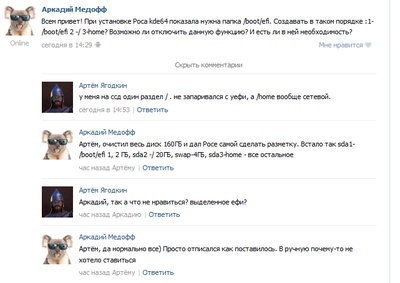 Вот тут в сообщении я скрин свой человеку показывал: http://forum.rosalab.ru/viewtopic.php?f ... 655#p45183CaptainFlint писал(а):Поподробней, плиз. Какая изначальная конфигурация разделов, в каком порядке удаляются/создаются разделы, назначаются точки монтирования? Лучше, наверное, даже в форме видео, чтобы были чётко видны все шаги.PastorDi писал(а):Только теперь раздел с efi предлагает /home монтировать.