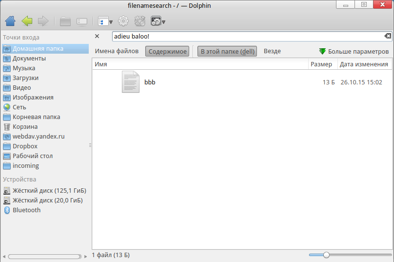 $Видимо, это поиск без индексации просто. Типа того, как в mc и многих других файловых менеджерах. А Baloo индексирует файлы, чтобы ускорять поиск.Delles писал(а):Вопрос: кто же осуществляет поиск, если Балу в берлоге? И зачем тогда Балу?