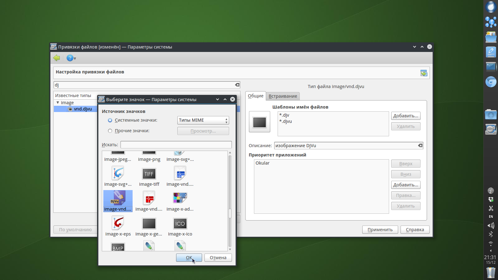 В Параметры системы-Привязки файлов. Находим нужный тип файла, выделяем и жмем на иконку и ищем какая нужна. Типа MIME который показуется для djvu не сохраняется почему то. Конкретно для okular нету значков.