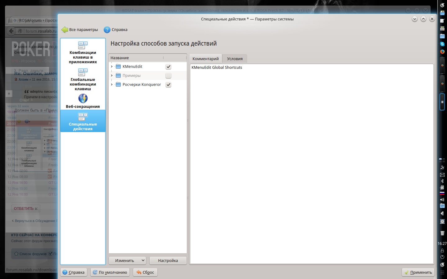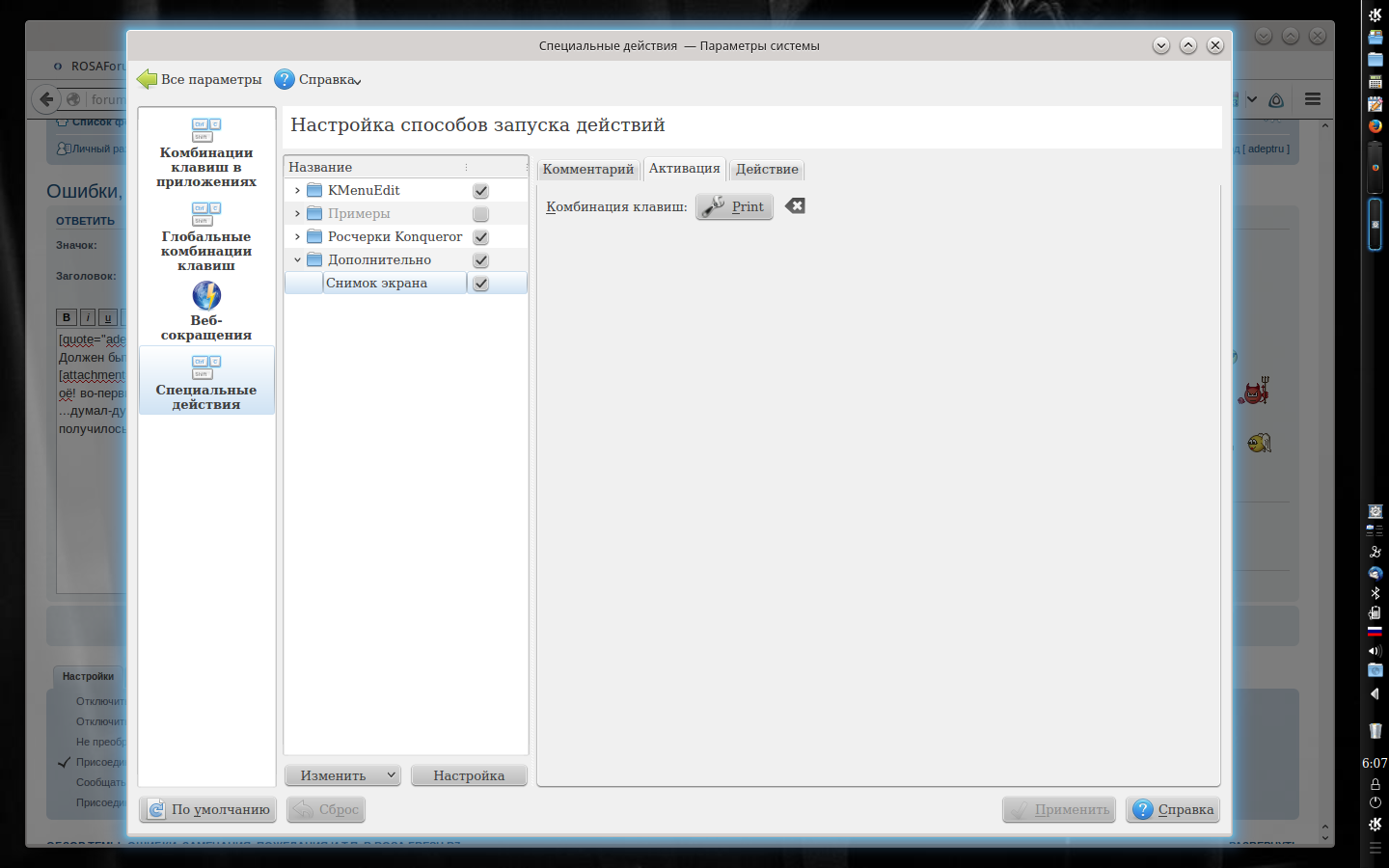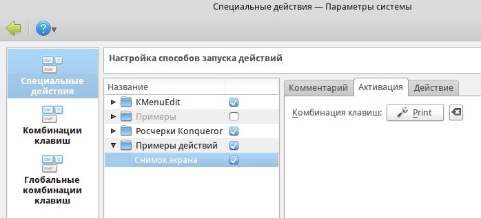 ...думал-думал и рискнул - сделал самостоятельный пункт (у меня ведь такого, как у Вас не было), а там уже комбинацию, к которой прикрутил KSnapshot, получилось!Алзим писал(а):Должен быть в «Примеры действий».