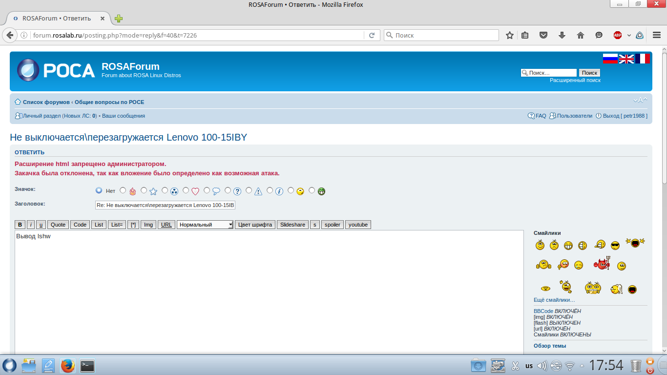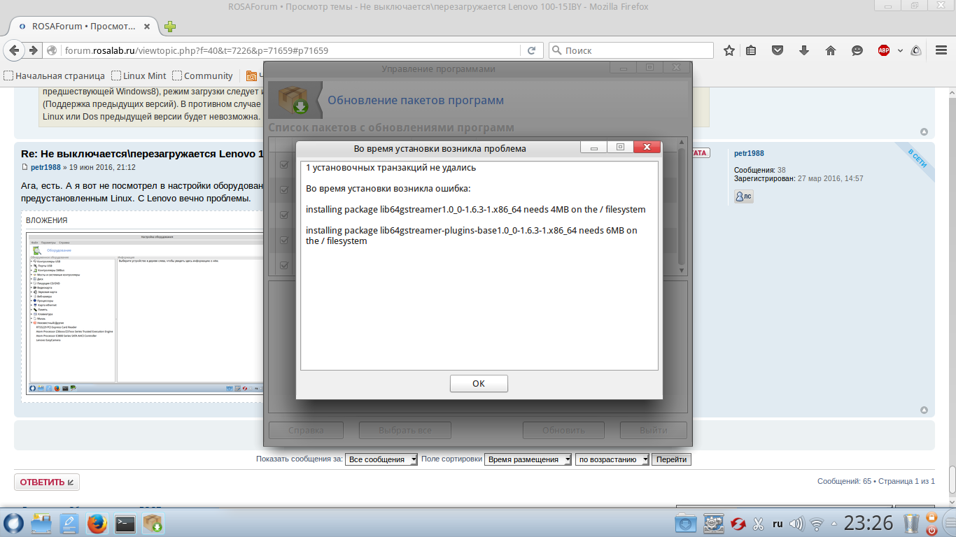 Здравствуйте. Установил Роса MATE. Система работает без нареканий. Но вот когда пытаюсь перезагрузить то вроде как система выключается(гаснет экран), а железо продолжает работать(слышно работу жесткого). А при команде на выключение на экране остается лого Росы, но железо выключается. Эта проблема была и на Роса KDE. В убунтободобных (Linux Mint, xubuntu) проблема решалась обновлением ядра как минимум до 4.4. Сейчас на Росе ядро 4.5.7, но проблема остается. Может ли быть, что это связано с bios? У меня InsydeH20 v2.5. Система стоит в uefi, secure boot отключен. Пробовал, кстати, и в legasy boot устанавливать, не помогло. Надеюсь на вашу помощь. Заранее спасибо.