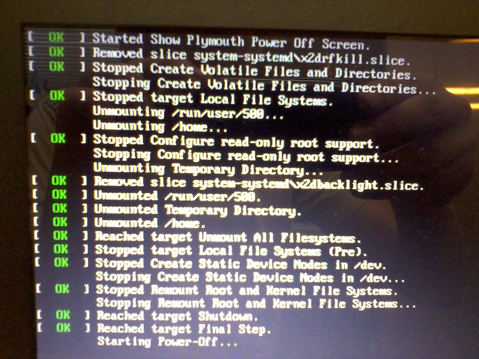 Поставил федора с ядром 4.2.3, не перезагружался. Обновился до 4.5.6 и все заработало. Дал команду на выключение - выключился, на перезагрузку - перезагрузился.