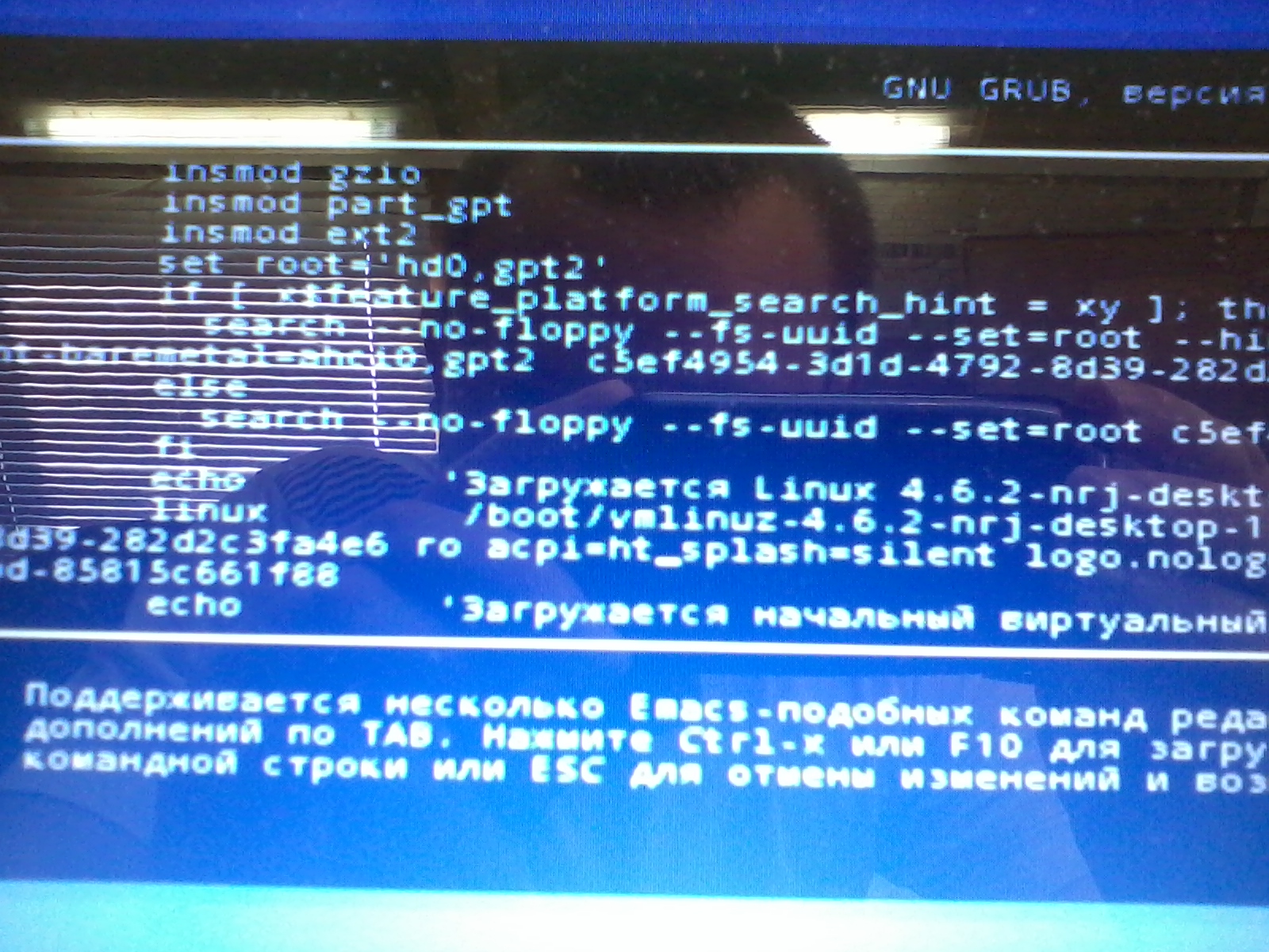 Эксперименты с параметрами grub результатов не принесли. Поэтому взял конфиг с федоры и собрал ядро. И ЗАРАБОТАЛО :Yahoo!: :Yahoo!: :Yahoo!: :Yahoo!: :Yahoo!: Всем спасибо за помощь! Правда во время установки ядра постоянно выходило требование установить какой-то libelf-devel и еще парочка ошибок. Версия ядра еще показывает почему то 4.6.0, а я ведь загружал 4.6.2. И при загрузке(с новым ядром уже) пара желтеньких строк выскакивают(не успеваю прочитать), в каком логе можно посмотреть? Кстати, в /var/log/ появился syslog. И еще вопросик. Можно сделать бэкап рабочего ядра? А то вдруг на время поставлю другой дистрибутив. На пробе оборудования ноут также виснет.
