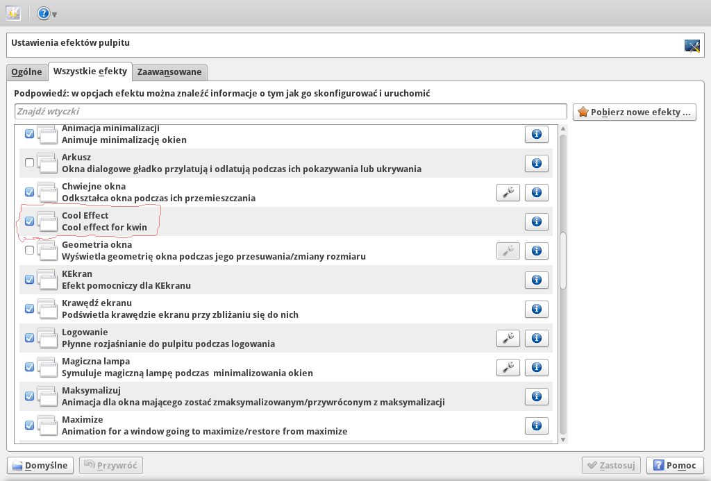 Z powodu zmiany servera ulubione efekty pulpitu można zainstalować ręcznie oto link skąd można pobrać 5 brakujących efektów https://api.kde-look.org/p/1110512 I w skrócie wyjaśnie jak można je zainstalować zajmijmy się cooleffect. Po pobraniu pliku należy go rozpakować w efekcie czego będziemy mieli dwa pliki: metadata i contents zmieniamy nazwę pliku metadata na cooleffect i odkrywamy ukryte pliki w Dolphinie i otwieramy katalog .kde4 następie share/kde4/services i do services przenosimy plik ze zmienioną nazwą. Teraz czas na drugi plik, otwieramy ukryte pliki i otwieramy .kde4/share/apps i w katalogu apps tworzymy nowy katalog kwin/effect/kwin4_effect_cooleffect i do tego ostatniego katalogu przenosimy contents. I to wszystko teraz wystarczy tylko restart kompa i możemy się cieszyć z miłego dla oka efektu.