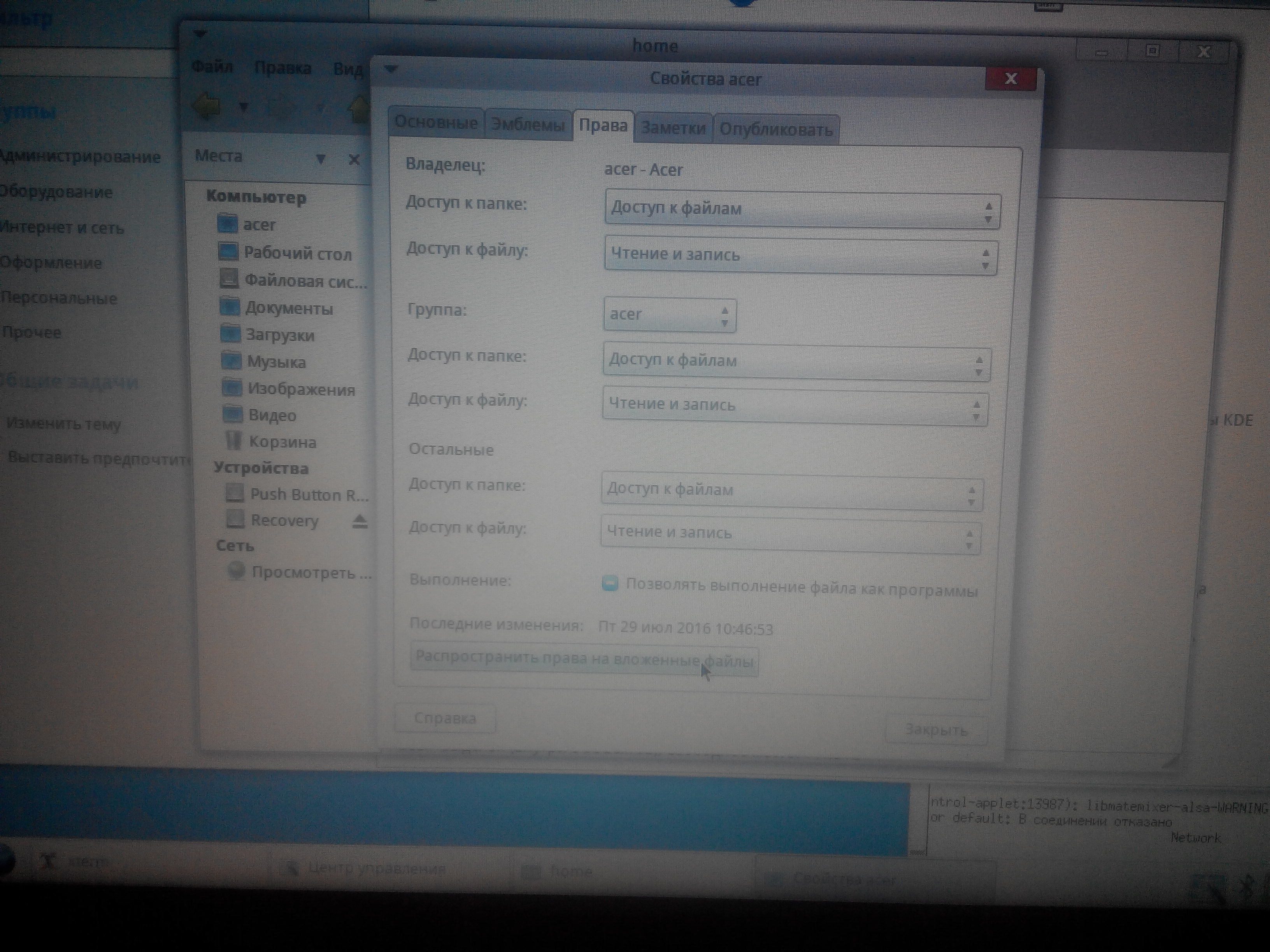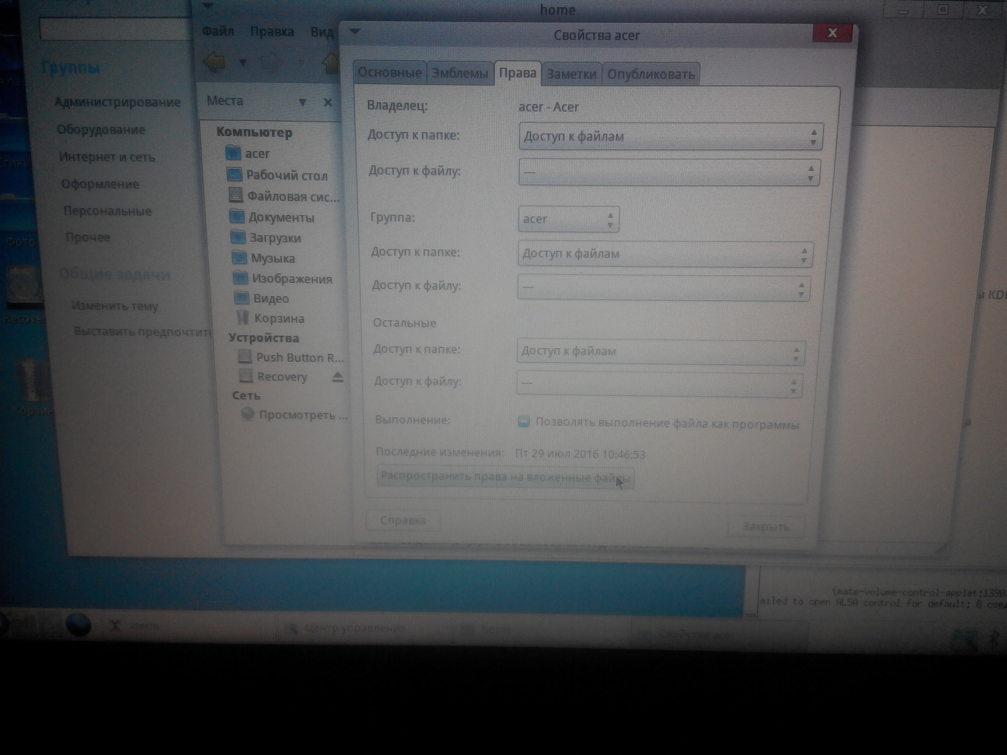 На мате запустился но какая то фигня с правами к /home/acer