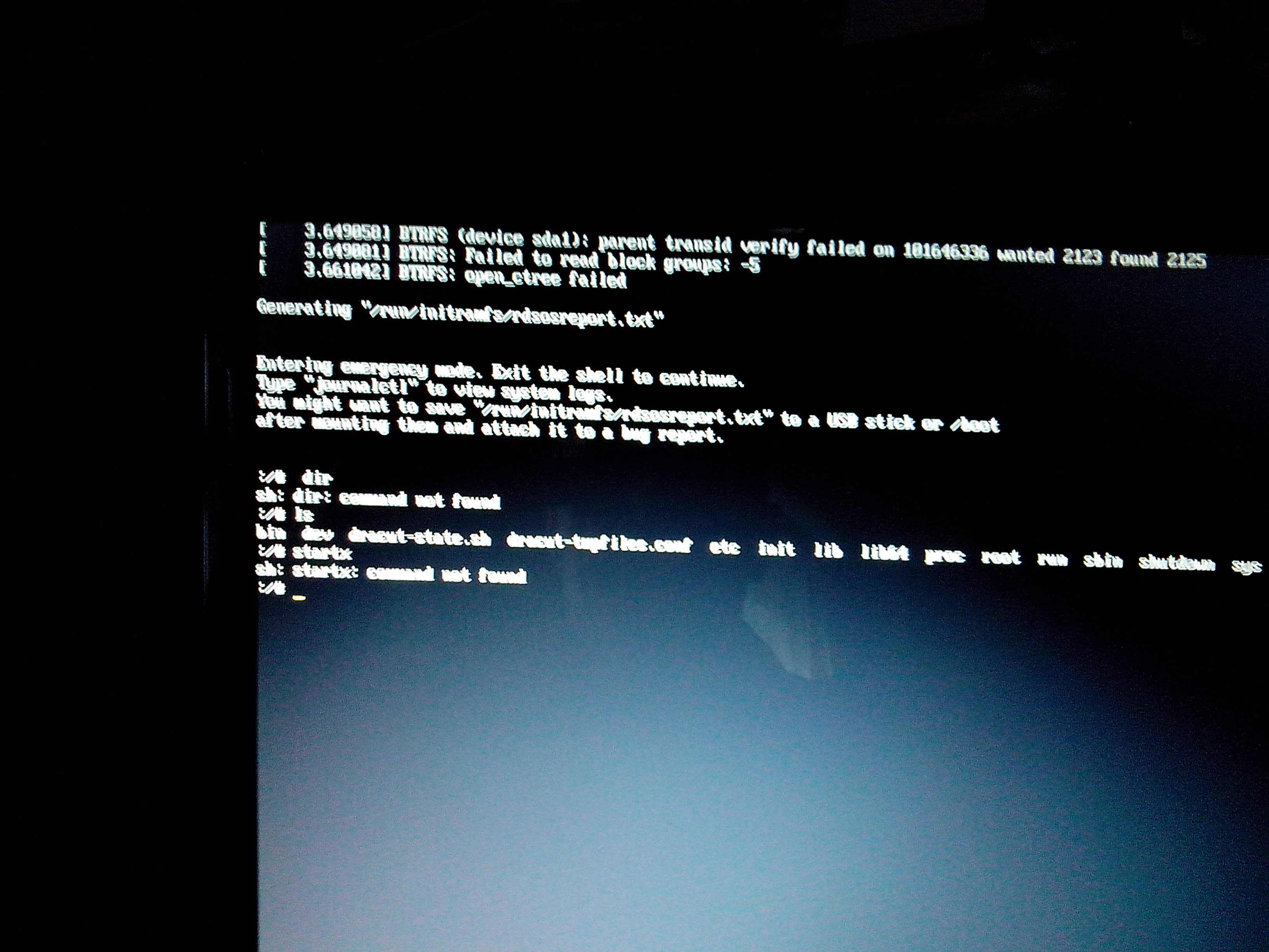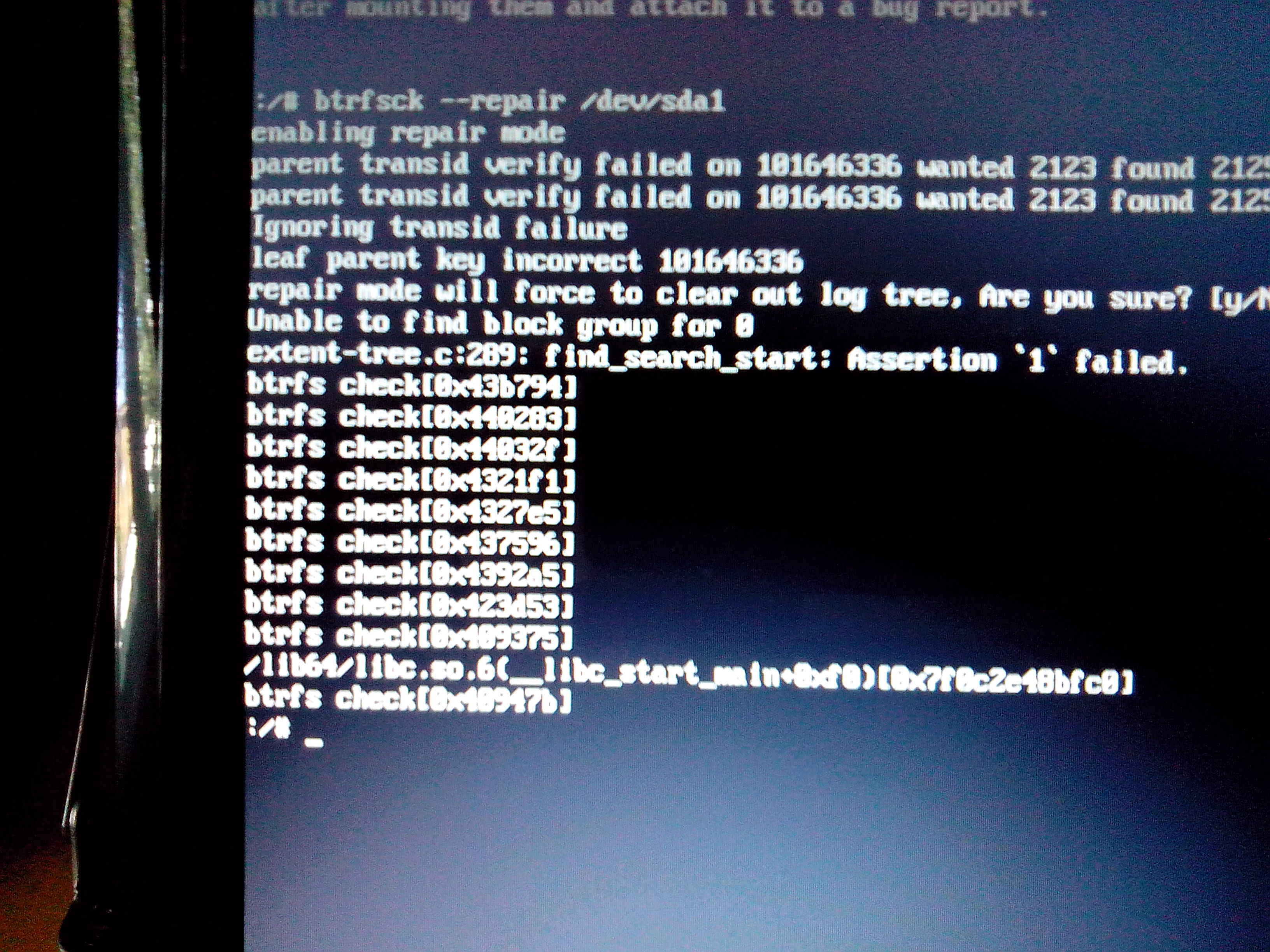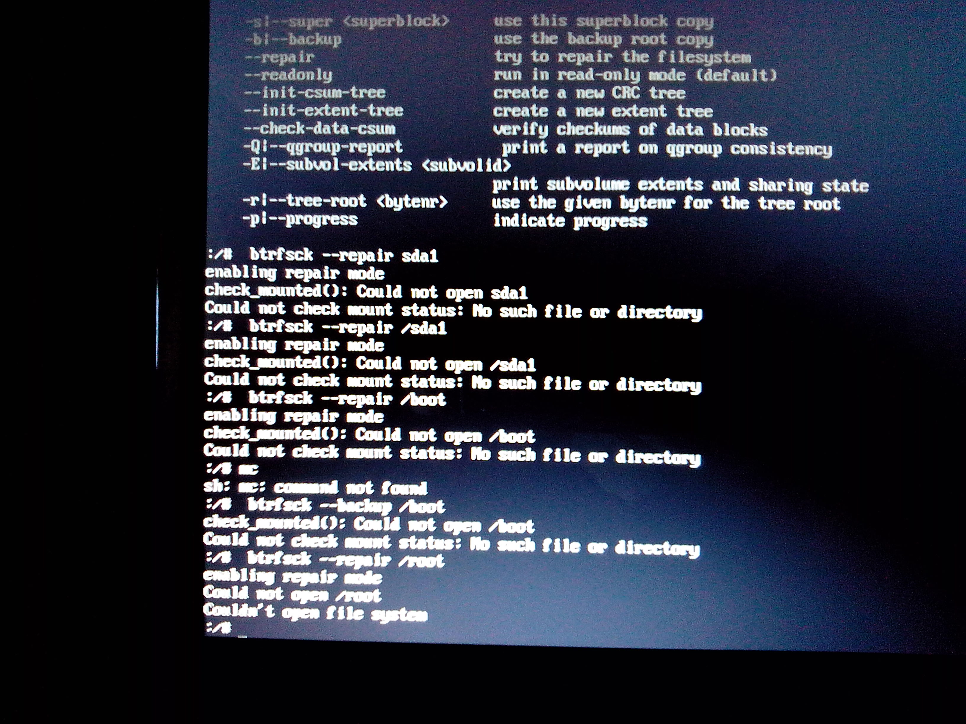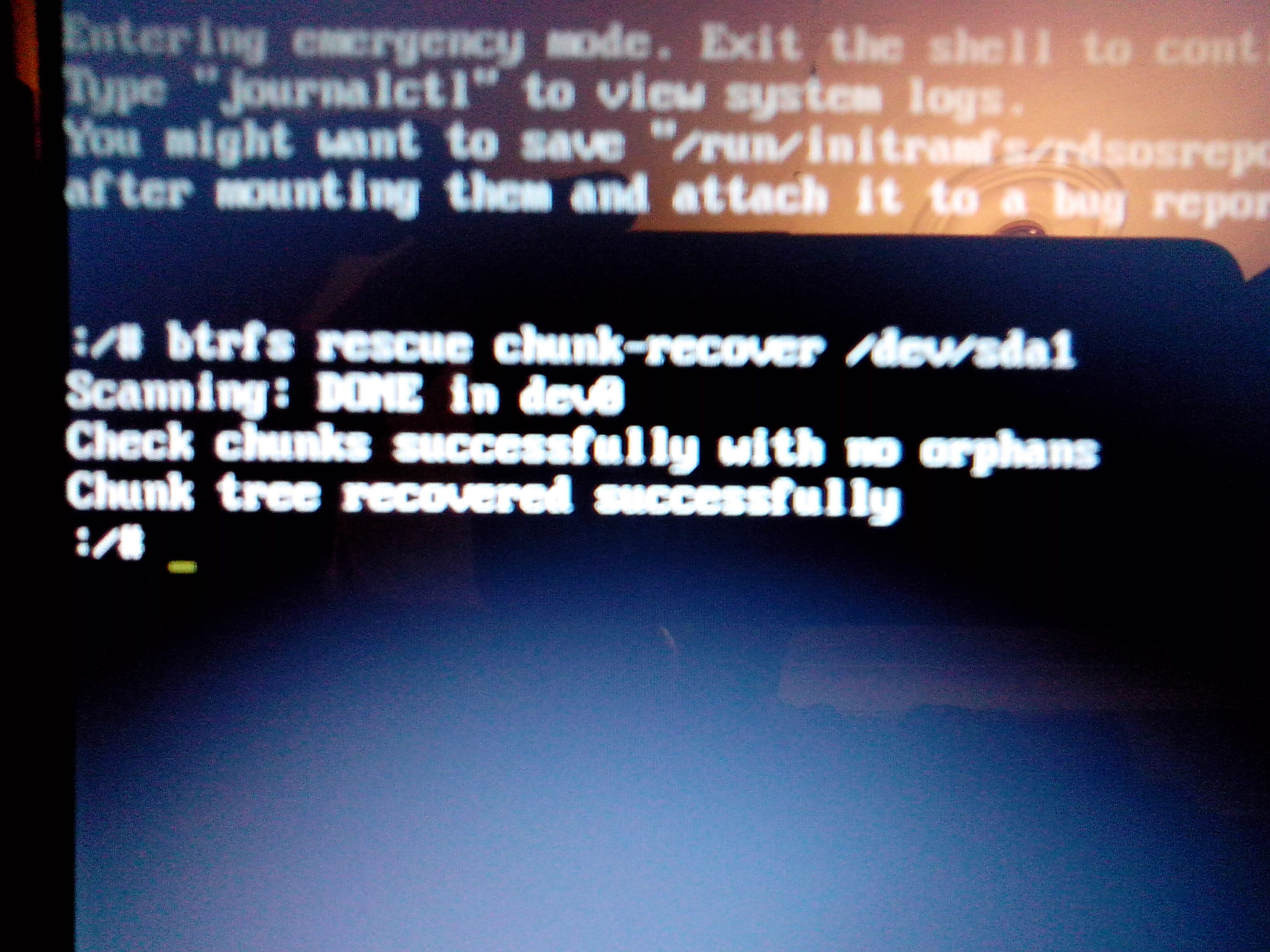 Мне кажется восстановление удобнее было бы делать, запустив Live систему с флешки. Тогда можно копировать из консоли в браузер, проще искать аналогичные ситуации. Кстати, по btrfsck repair поисковик одной из первых ссылок выдал рекомендацию использовать btrfs rescue chunk-recover http://www.linux.org.ru/forum/talks/10988788