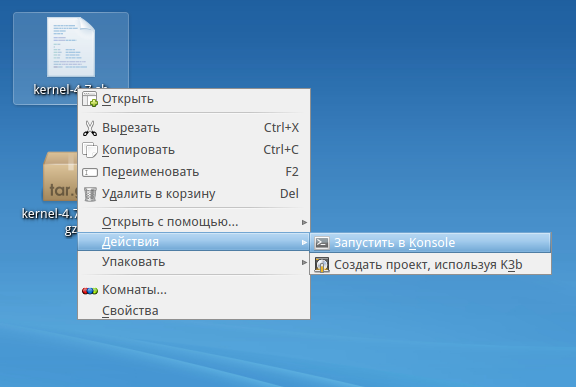 А потом запустить в Konsole, опять же нажав правой клавишей мышки: