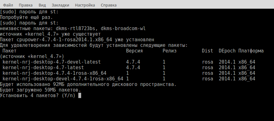 Я когда пыталась ядро менять, там что-то появлялось, типа запроса пароля, ввожу, а он пишет "попробуйте еще раз" или "команда не найдена", уже и пароль пользователя вводила, и пароль администратора... или вообще кнопки не нажимаются при вводе пароля (вернее, кнопки-то нажимаются, но цифры не появляются).