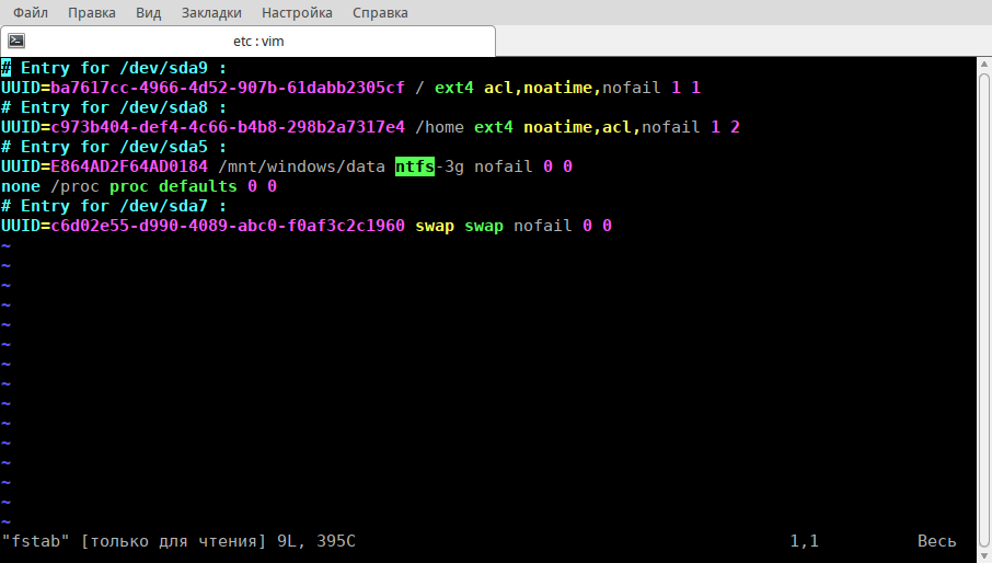 vzor74 писал(а):А редактирование fstab не может в этом помочь? ..... это были разделы с ntfs.