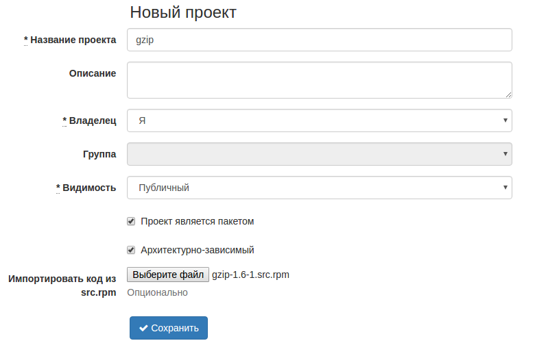 Зашёл в ABF и нажал кнопку "Новый проект". Задал вот такие параметры и указал путь к файлу src.rpm