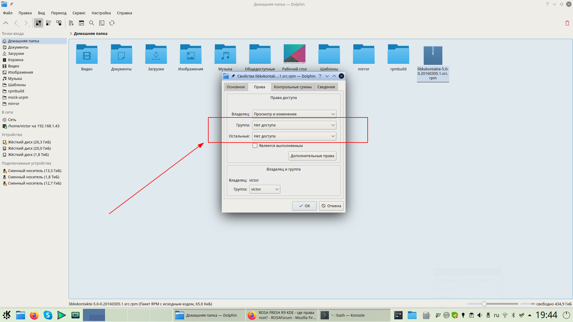 Прошу прощения, Виктор. Искал но не мог найти как задавать права доступа с помощью команды chmod в Росе. И в графическом режиме не получается. Например задаю права только для владельца а они пропадают. Пытался установить маску с помощью команды umask. После того как закрываю консоль все возвращается по умолчанию. Почему команды прав доступа chmod, umask не работают в Росе? Или работают лишь пока не закрою консоль. Тоже и в графическом режиме. Запускал команды от root.