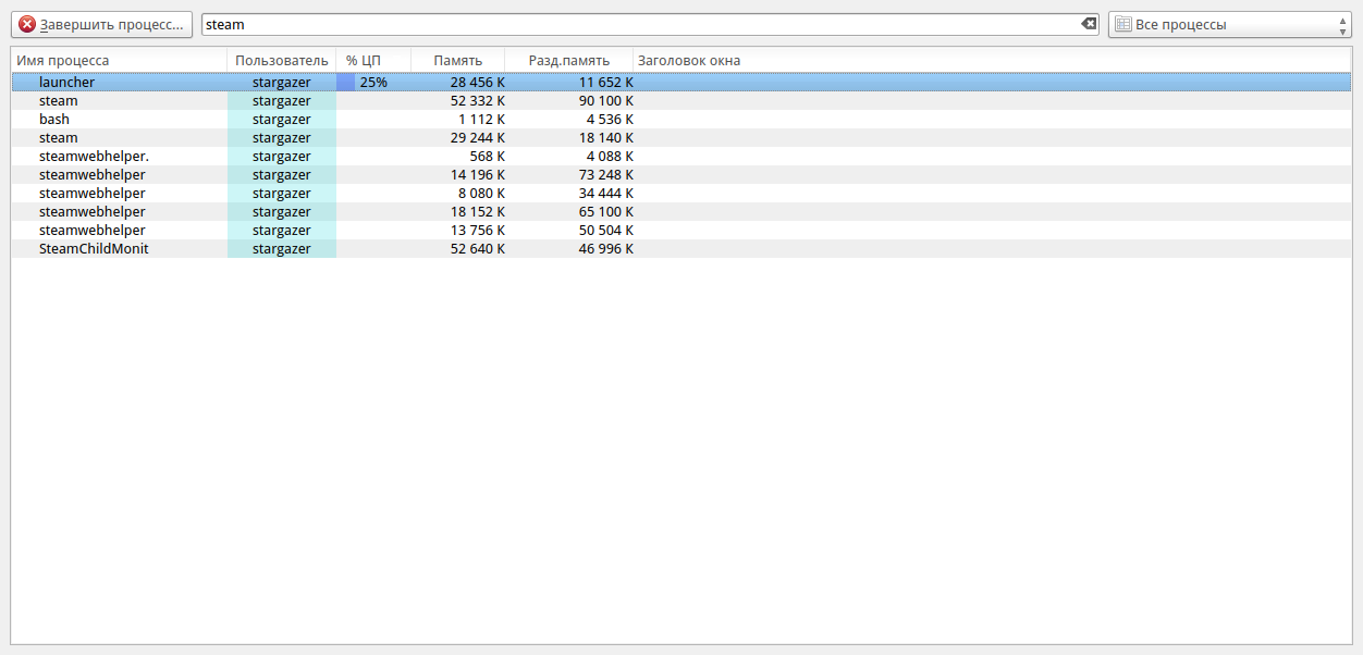 После выключения игры и даже после выхода из Steam процесс остаётся запущенным вместе со своим материнским процессом SteamChildMonit и продолжает потреблять свои 25%.