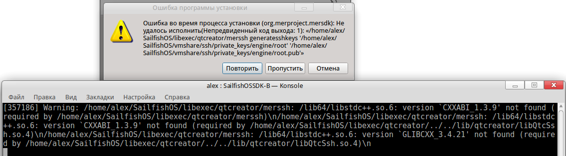Насчет же SailfishOS SDK - может, оно 32-разрядное а вы в 64 разрядную систему ставите? Попробуйте доставить 32-разрядную библиотеку.