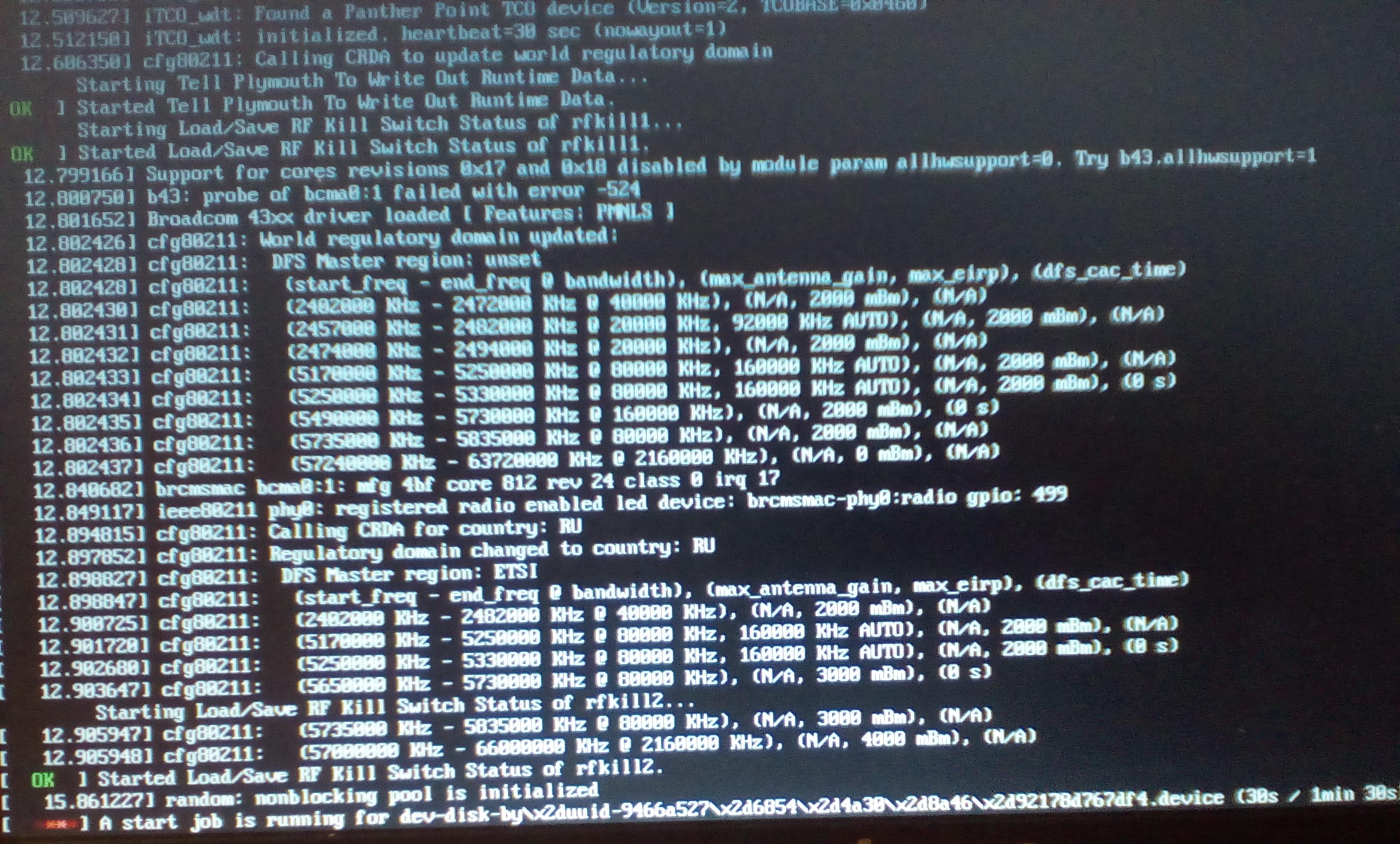 Не знаю когда это началось. Когда-то давно система грузилась быстро. 30-60 секунд. Некоторое время назад стал замечать, что время загрузки стало меня раздражать. Решил поменять HDD на SSD. После этого заметил, что графическая заставка демонстрирующая процесс загрузки, очень быстро показывает 100% и застревает надолго. Отключив заставку, я увидел картинку как на приложенной фотке. Пока не пройдут полторы минуты загрузка не продолжается. Поискав информацию в интернете, выяснил, что это известный баг процессора Intel и с одной стороны, он вроде бы не лечится, а с другой стороны, не сильно и мешает. Но хотелось бы, если не проигнорировать эту операцию при загрузке, то хотя бы сократить время ожидания, а то 90 секунд - это много. Заранее спасибо.