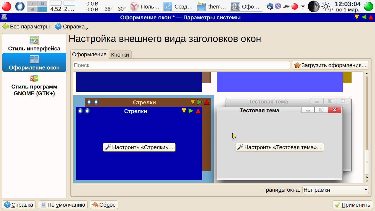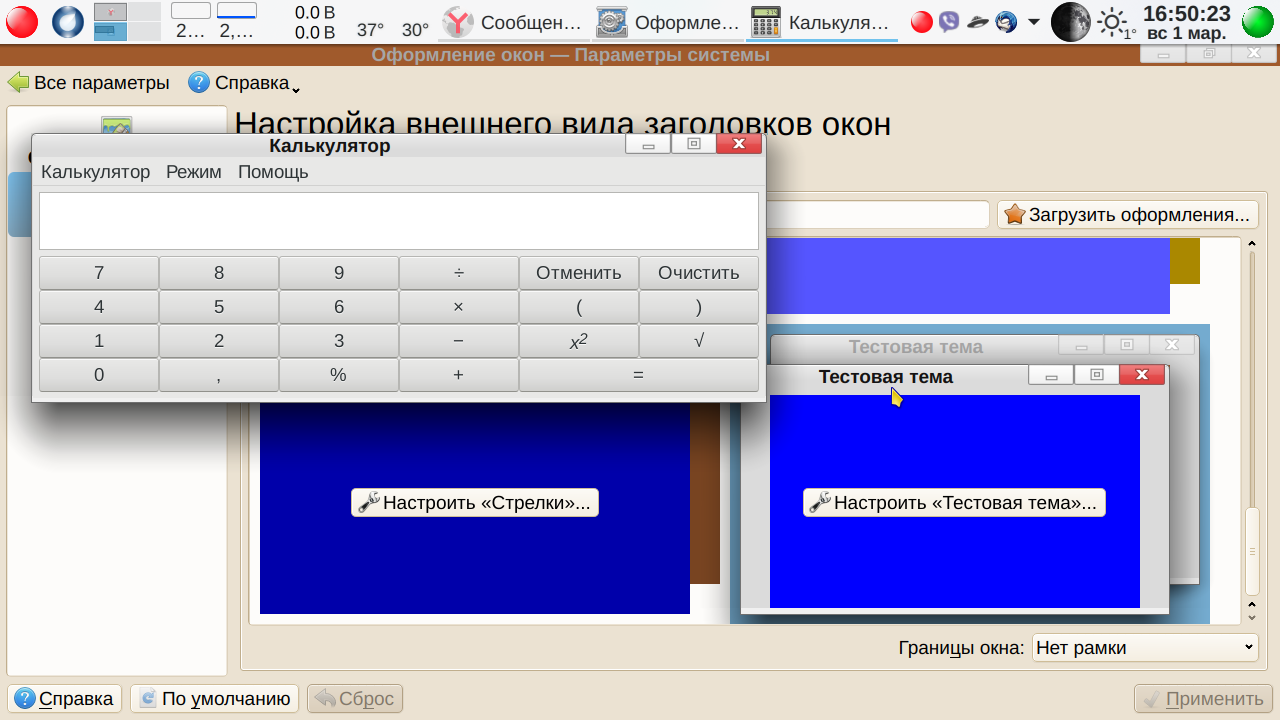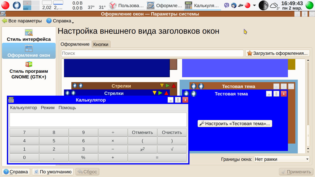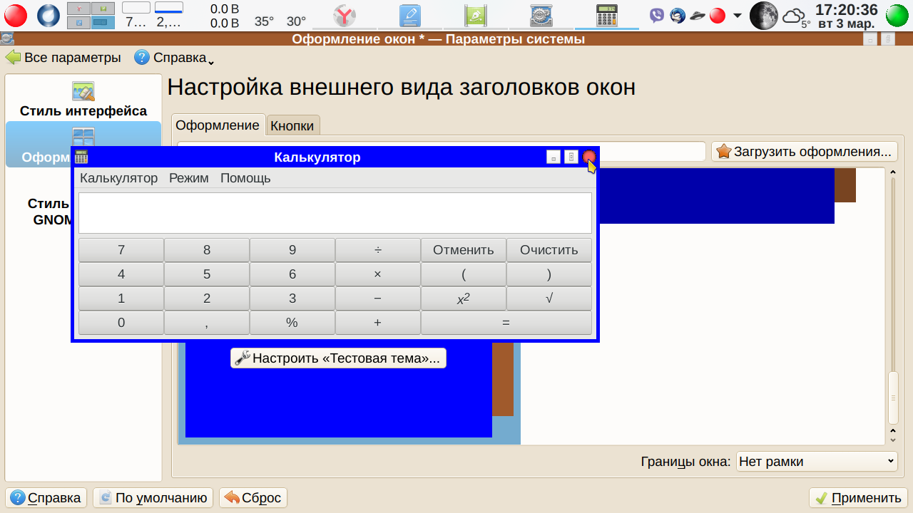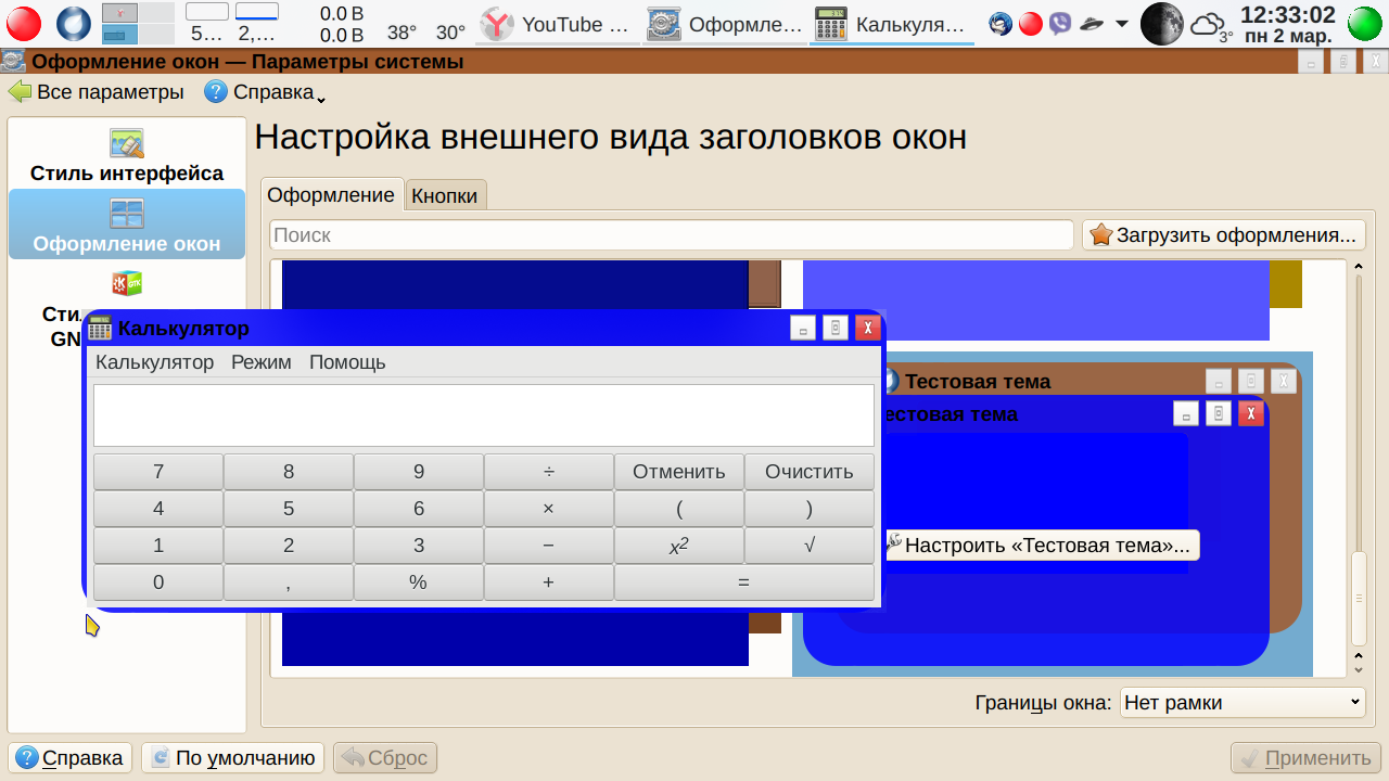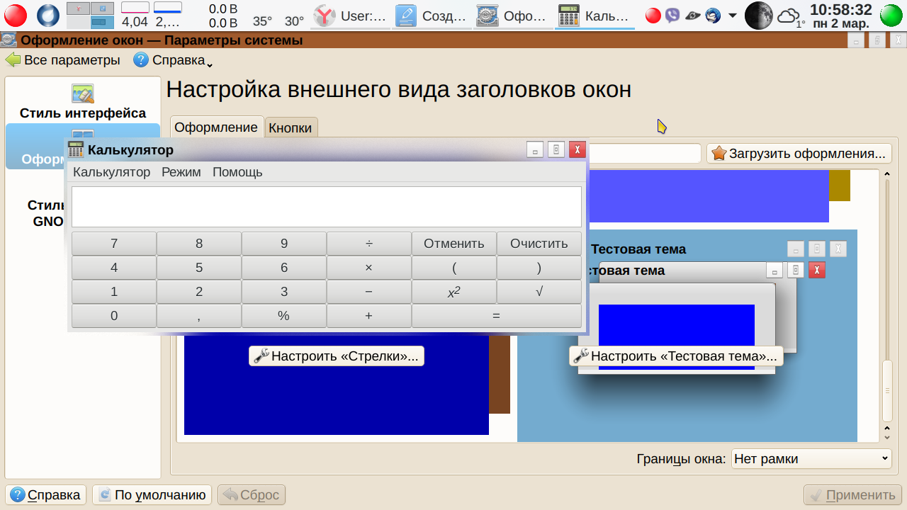 Кстати, если сделали не правильное телодвижение, то всегда можно отменить действие: Меню-→Правка-→ Отменить:<Наименование отменяемого действия>. Теперь сохраняем файл. Просто сохраняем как есть. Меню-→Файл-→ Сохранить. Пусть остается svg, паковать пока не будем. Переходим теперь в Параметры системы → Оформление окон (промежуточные вкладки для краткости опускаем). Что у нас получилось? А получилось… ничего. Как была тема, так и осталась. В чем дело? Вот тут мы подошли к еще одной трудности, с которой, судя по отзывам, многие сталкивались — изменения внесены, но ничего не изменилось. А что если применить нашу чуть измененную тему? В «Параметрах системы» изменения вступили в силу — заголовок активного окна синий, неактивного, как видно из скриншота — коричневый. А вот, скажем Калькулятор МАТЕ остался серым. Серой же осталась тестовая тема в окне выбора в Параметрах системы.