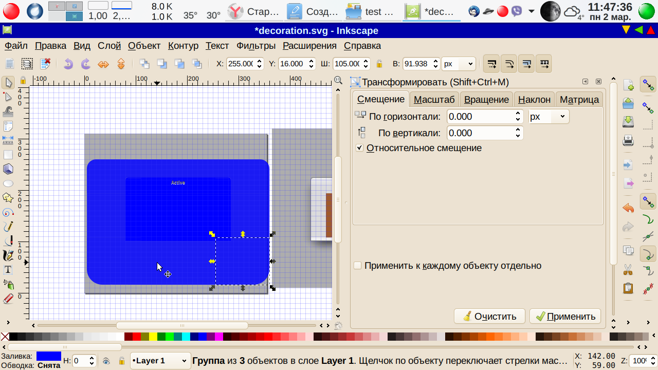 Выделив объект, идем в меню-→Объект-→Заливка и обводка. Все ясно = по умолчанию непрозрачность 25%. Доводим до 100% и получаем синий фон. Дальше нудная работа. Нужно скопировать объект и вставить аж 9 раз. Восемь пойдут вокруг только что созданного квадрата, а девятый — в качестве центрального для неактивного окна. Пока будет синий. Толлько предварительно еще уменьшим первый квадратный объект чтобы не пришлось менять размеры у крайних квадратов, вписывая их в документ. Как мы знаем, объекты могут выходить за пределы документа, ничего страшного — но… не очень красиво как-то… И в файловом менеджере и в приложении для просмотра картинок будет неполное отображение. Как-то вот так: