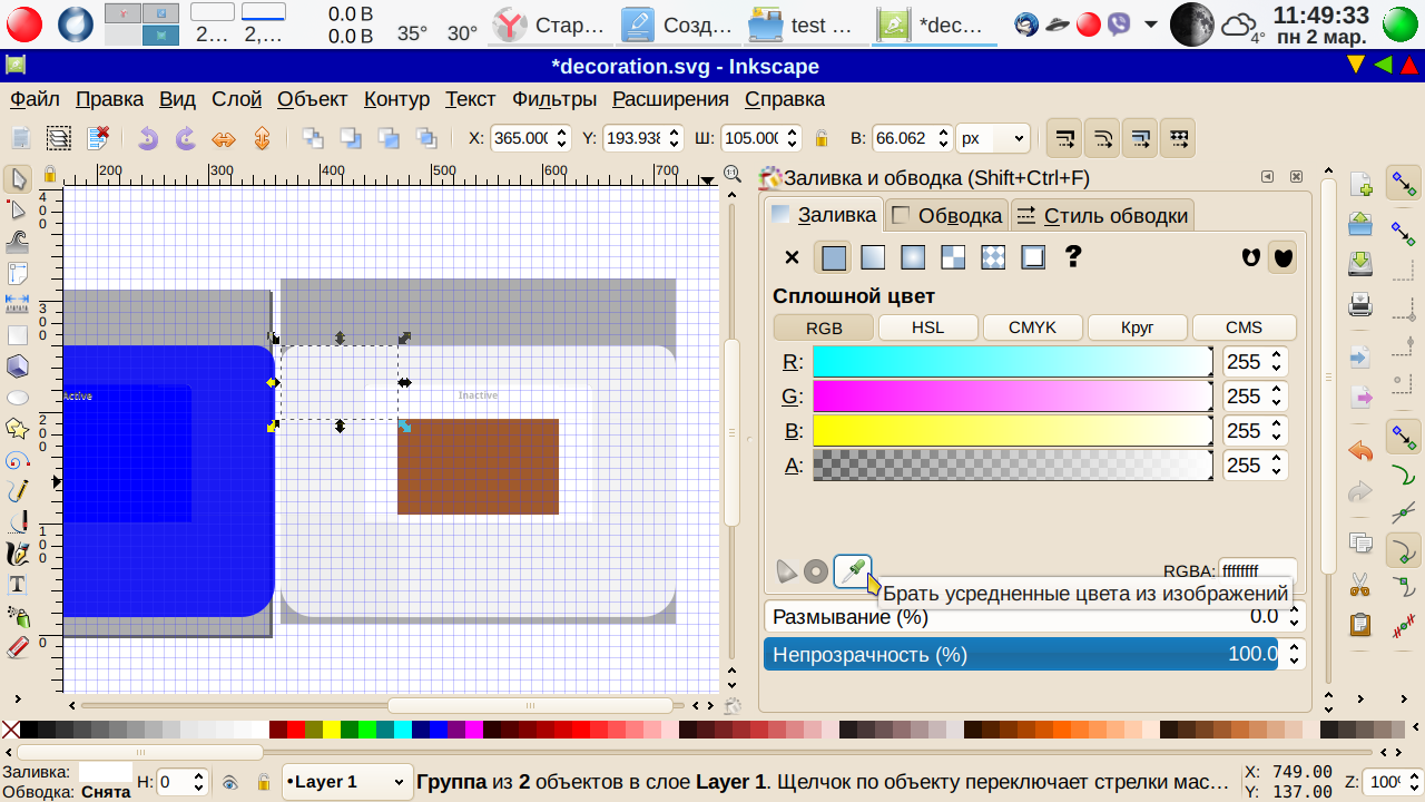 Теперь немного усложним задачу — выберем центральный объект неактивного окна и зальем его коричневым — нужно поискать в полосе предлагаемых цветов. Ну, пусть будет вот так: