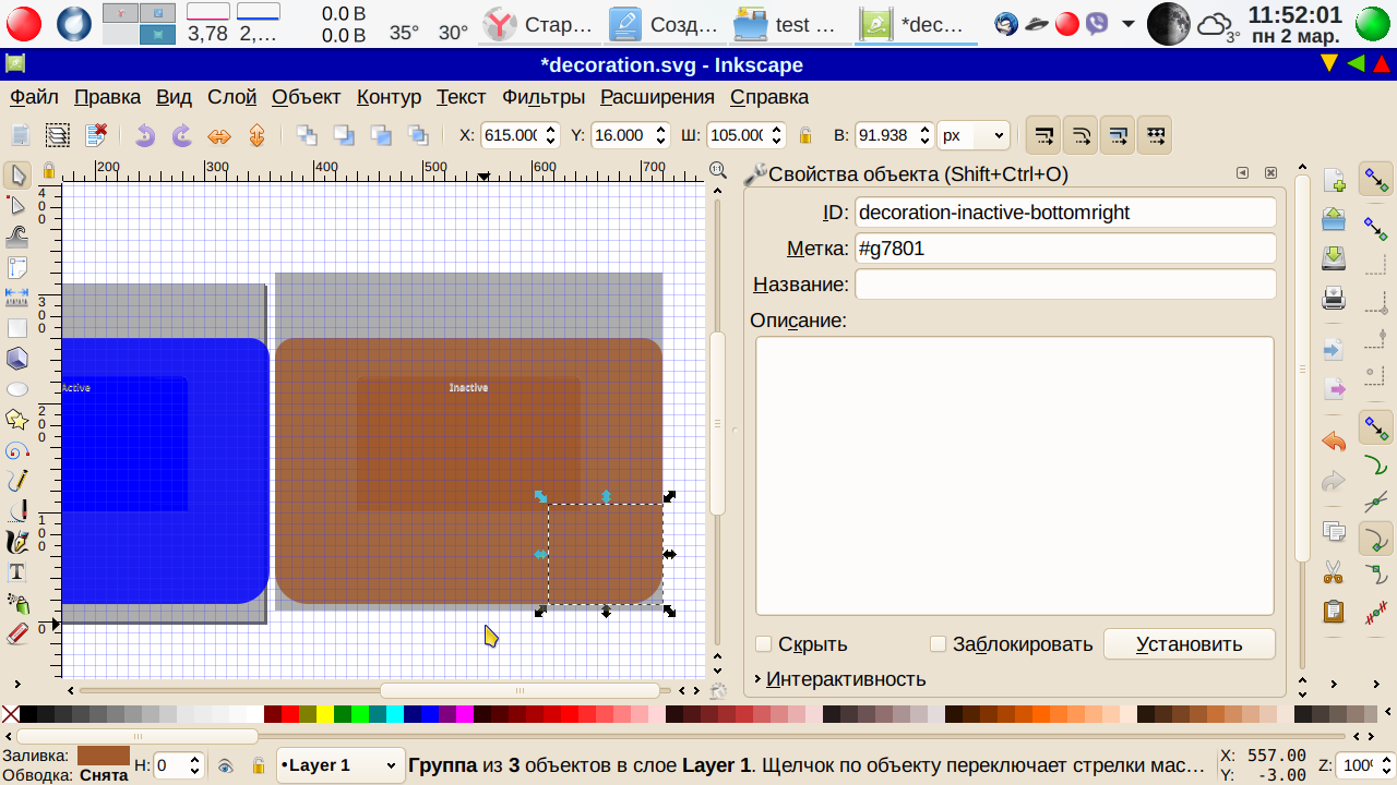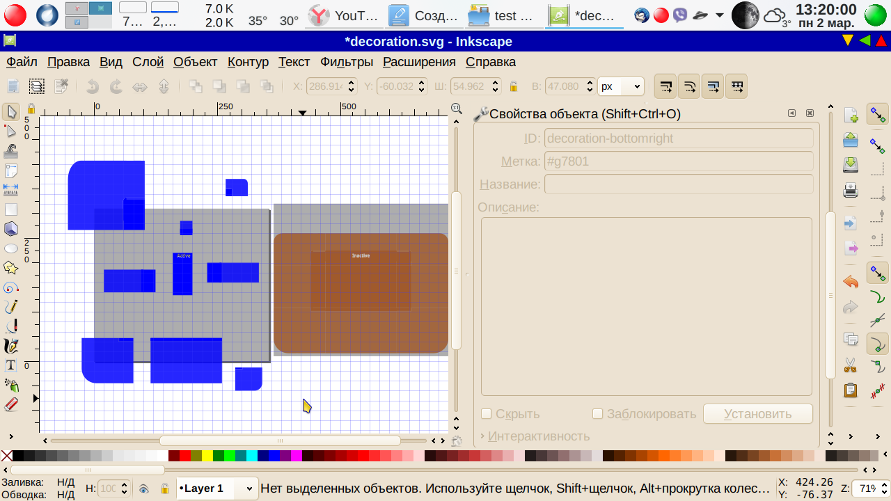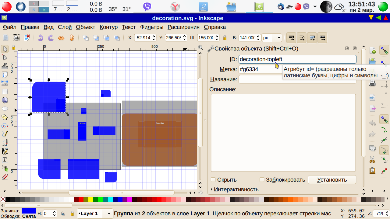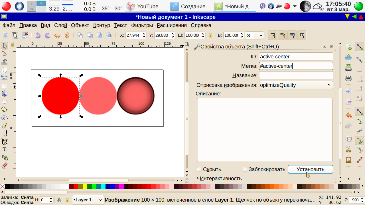 . Выделяем первый объект и присваиваем им ID. А именно, выделяем первый объект. Меню→ Объект → Свойства объекта, ID — меняем на active-center, метку н #active-center Последнее не обязательно, просто для порядка. Как всегда при изменении ID и метки не забываем нажимать кнопку Установить: