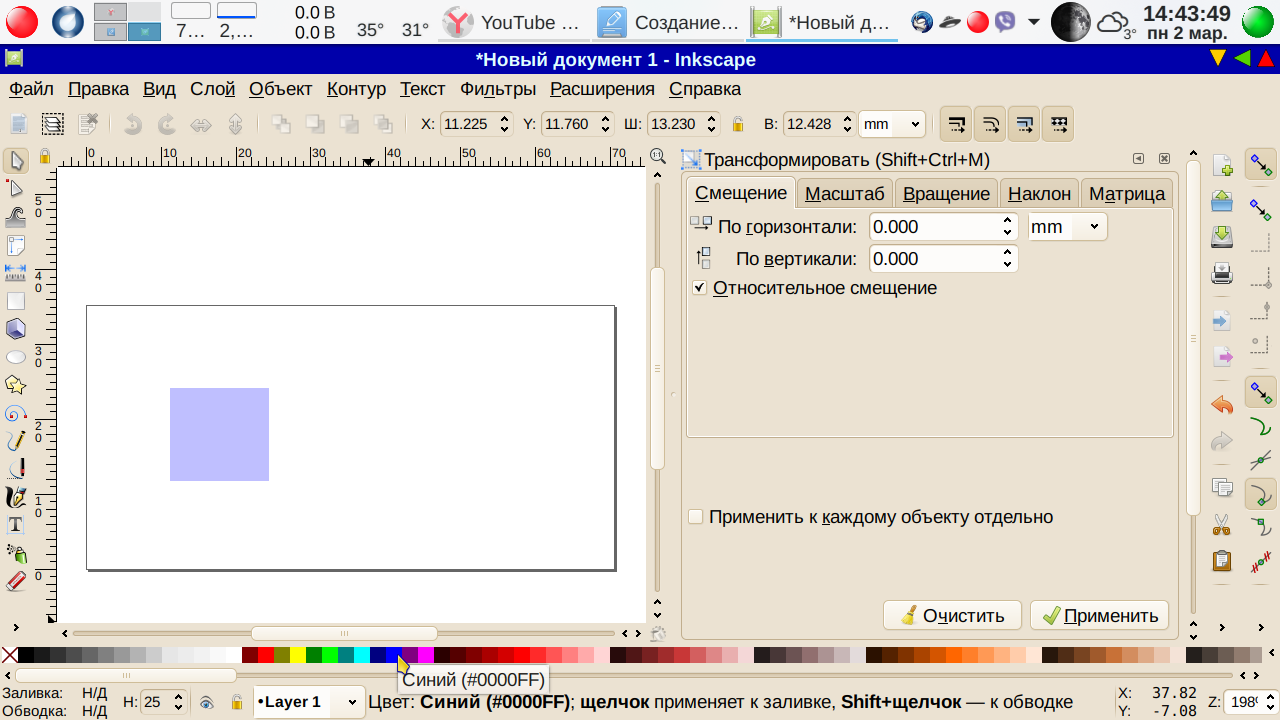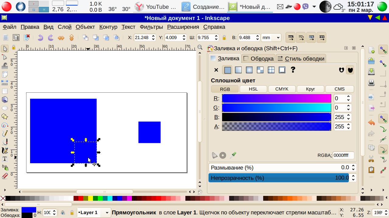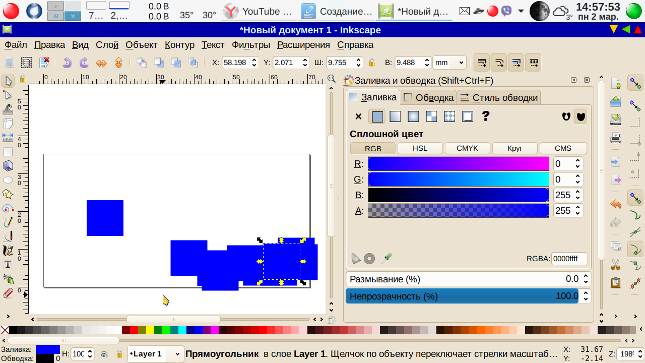 Увеличиваем масштаб до комфортной величины — напомню, клавишами «плюс» и «минус». На левой кромке у нас панель инструментов — выбираем «Рисовать прямоугольники и квадраты» и рисуем квадрат. Ну, пусть примерно квадрат — мы ведь уже знаем, то размеры и пропорции не имеют значения. Если квадрат получится со скругленными углами, выбираем на панели слева Редактировать узлы контура или рычаги узлов (курсор примет вид удлиненной стрелки) и сдвинем кружок в угол, убрав тем самым скругленность — пока будет делать угловатый фон, скруглениями углов займемся позже. В нижней линейке цветов заливки выбираем синий, и получаем… совсем не то, что ожидалось: