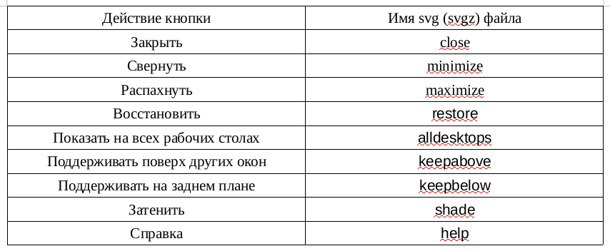 Тема окон aurorae представляет собой папку с несколькими файлами. В основном это файлы svgz (заархивированный файл svg), иногда просто svg. Они отвечают за цветовое оформление темы, форму кнопок, их анимацию, и некоторые другие особенности темы aurorae. На практике чаще всего используются четыре вида кнопок (в скобках приведены имена соответствующих файлов):