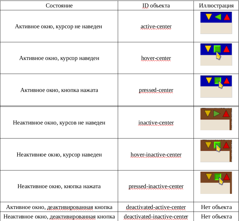 Внутри файла для каждой кнопки могут содержаться несколько объектов для разных случаев использования данной кнопки. Какие именно? Самый стандартный случай — просто открыто активное окно. Для такого случая имеется отдельный объект — рисунок, изображающий кнопку именно в этом состоянии (active-center). Теперь касаемся кнопки курсором. Что произошло? Может ничего не произойти, а может быть выведен другой объект svg файла, отвечающий за отображение кнопки при наведении курсора (hover-center). Наконец, нажимаем кнопку — объект может остаться прежним, а может быть выведен уже третий — все зависит от объектов внутри файла (pressed-center). Итак — три возможных изображения — обычное состояние, наведение курсора на кнопку и нажатие на кнопку. Это только для активного окна. Для неактивного окна можно добавить еще до трех объектов — обычное состояние неактивного окна (inactive-center), наведение (hover-inactive-center) и нажатие (pressed-inactive-center). Итого уже шесть возможных объектов. Но и это еще не все — можно добавить еще отдельные объекты для деактивированных кнопок, причем отдельно для активного (deactivated-active-center) и неактивного деактивированного окна (deactivated-inactive-center).
